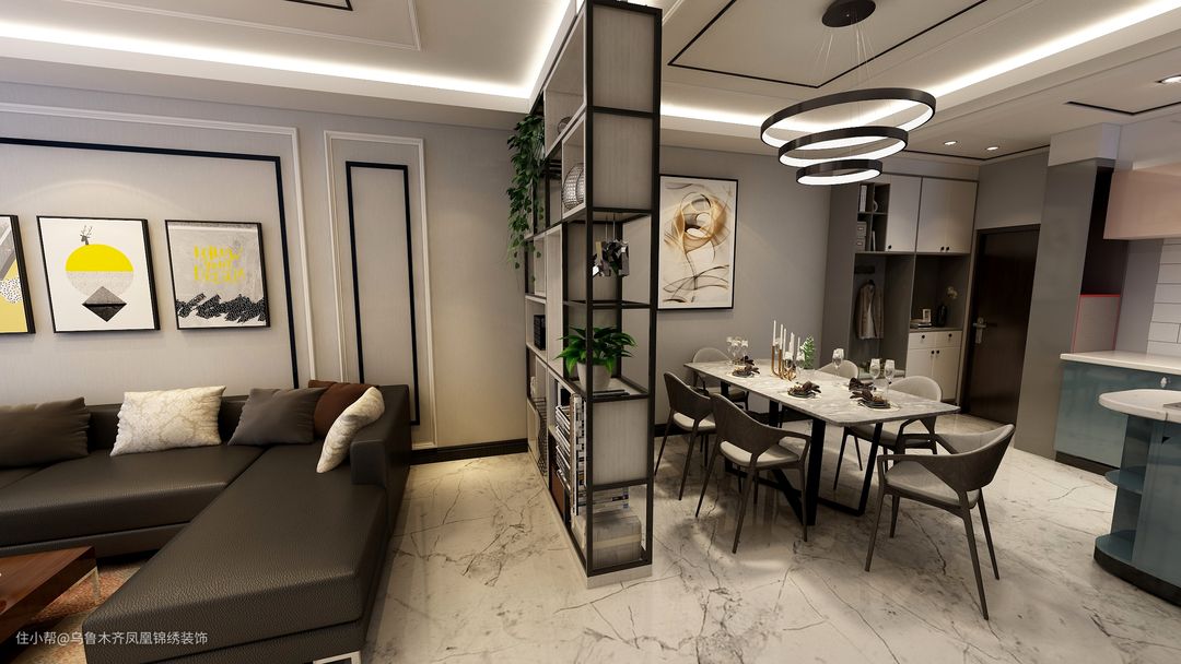 餐厅与客厅连接处使用镂空置物架作为隔断,高级黑作为两个部分的衔接色,统一配色,提升质感。