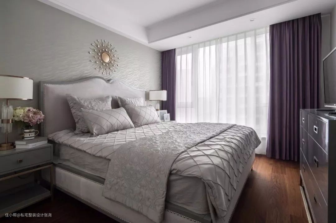 素色搭配看起来太过于单调,设计师在空间中填入紫色窗帘,魅力紫色在色泽上弥补了米白色的单调,在调性上打破了灰粉色的清冷。