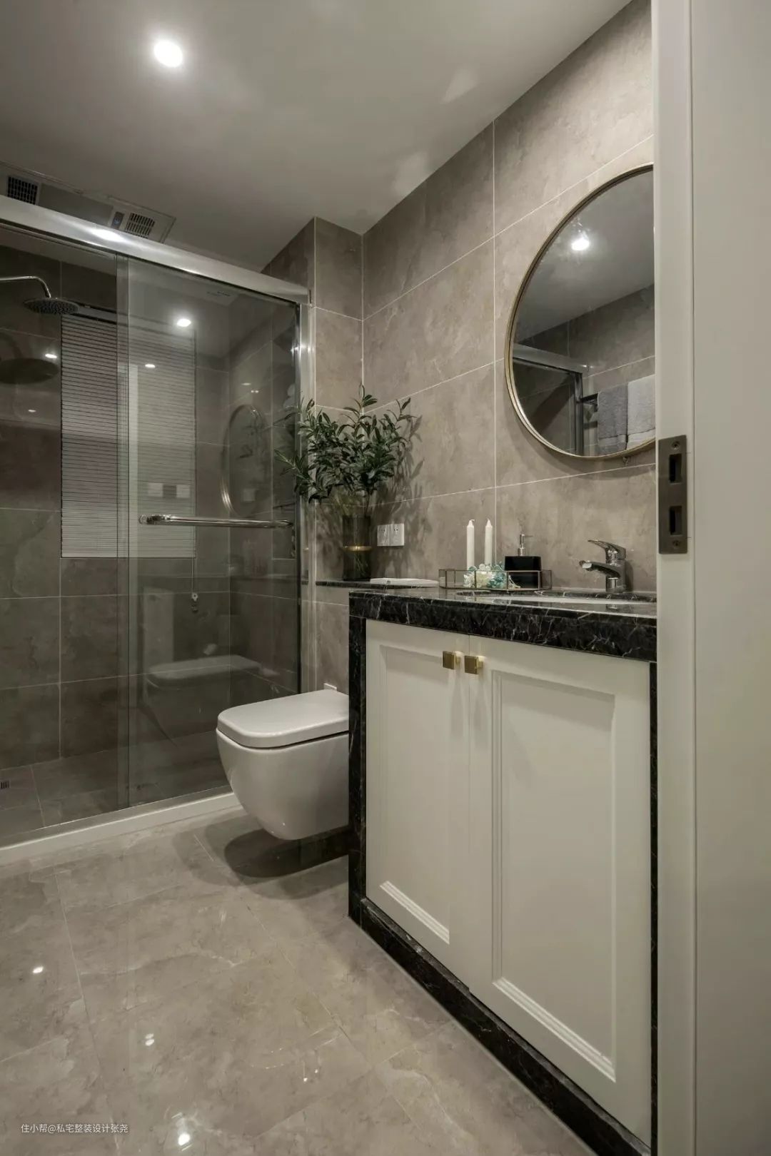 卫生间灰花大理石与黑色大理石的搭配,简约大气,金色边框的圆镜,和金色卫浴柜拉手,提升了整体的品质。