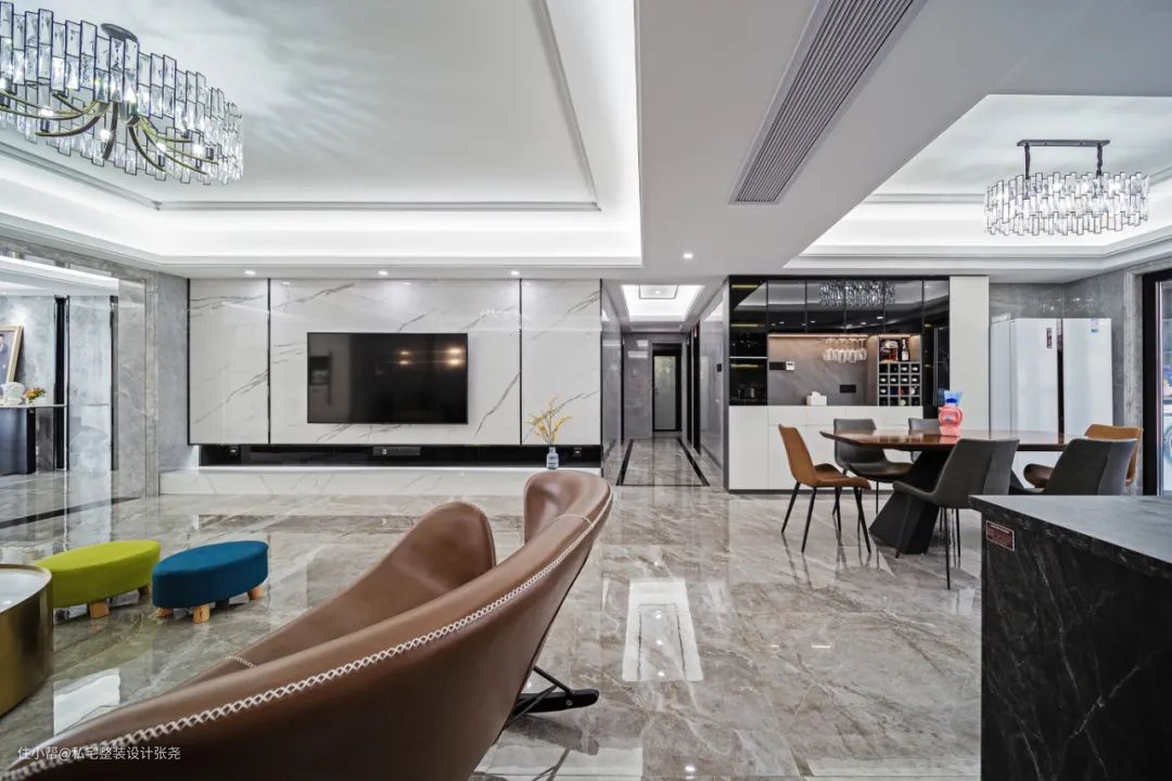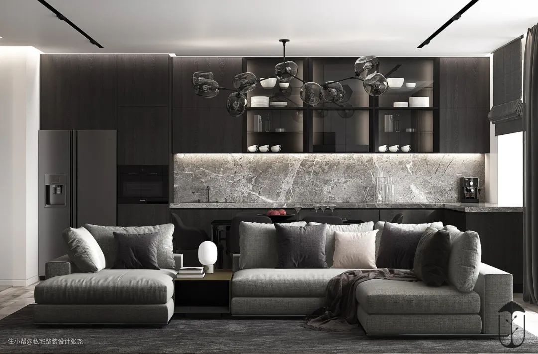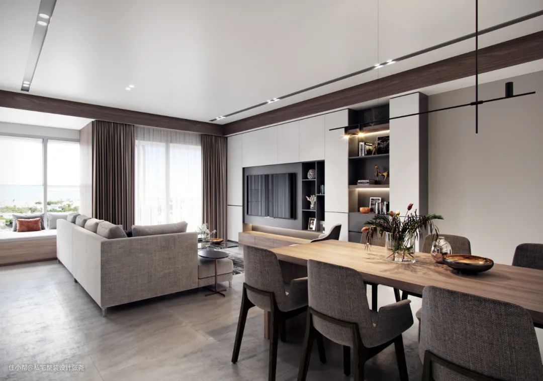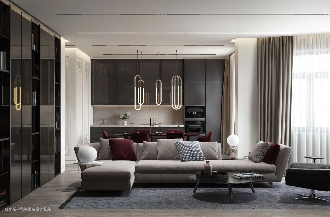 这也是很多人选择大平层的一个点。大平层设计一般需要打破客餐厅的传统分区概念,将客、餐、厨打造成一个空间。
