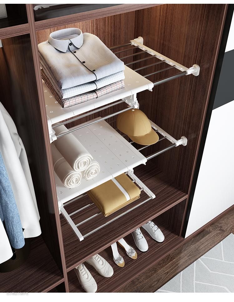 和伸缩杆的原理类似,这里是伸缩置物架。一般放在隔层不够的柜子里,把一层柜子变成两层。而且由于伸缩杆和柜体之间的接触面积更大了,所以使用伸缩置物架的过程中,并没有出现脱落的情况。