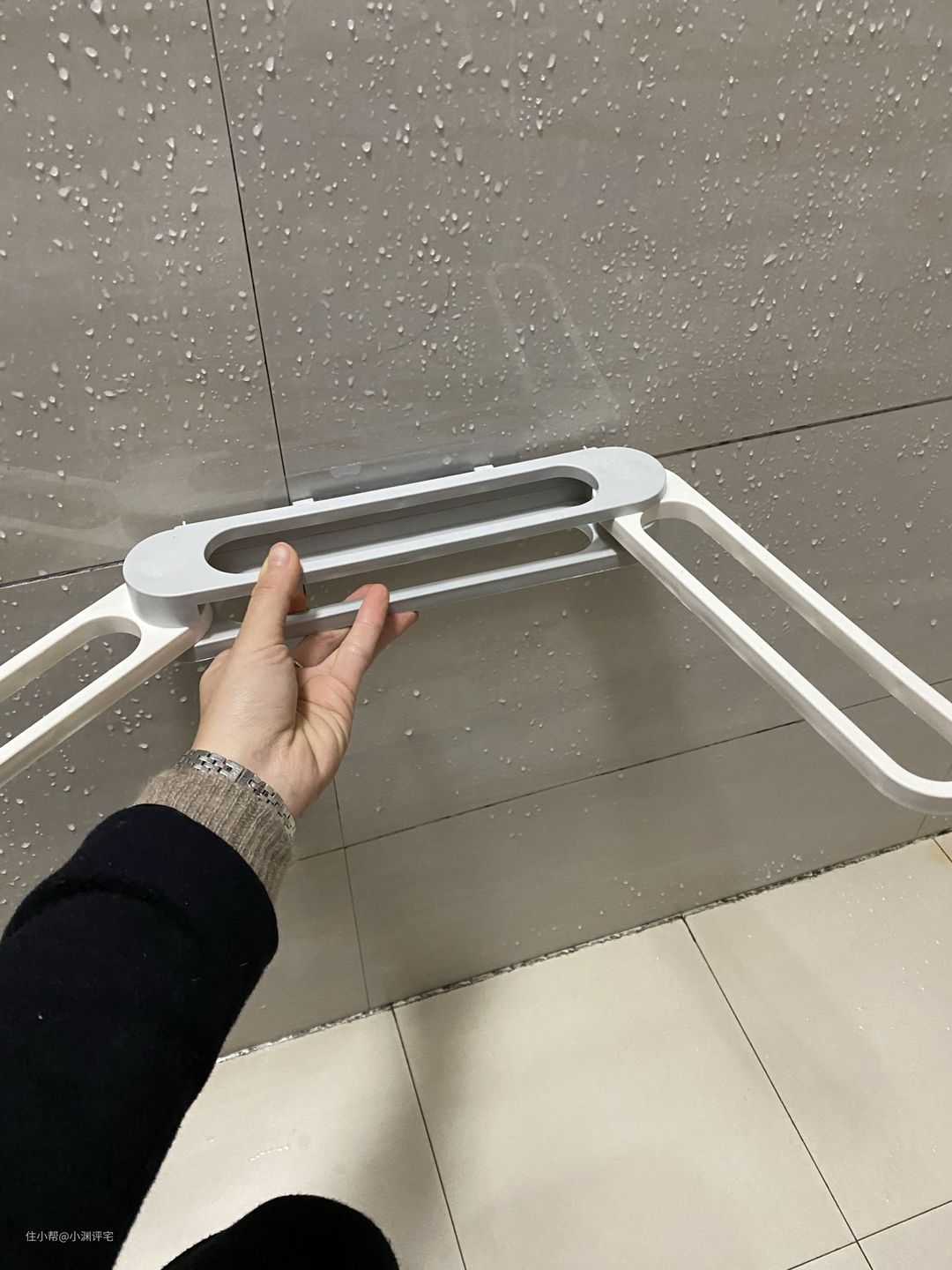 这个东西我是放在卫生间了,用来挂放洗澡时使用的拖鞋。它的好处就是可以折叠,展开后可以放三双拖鞋,这一次后放两双,再折一次放一双——非常适合我家这种家中人口数量不定的情况。背后用吸盘固定,可以随时拆下来清洗,比粘胶固定的更卫生。