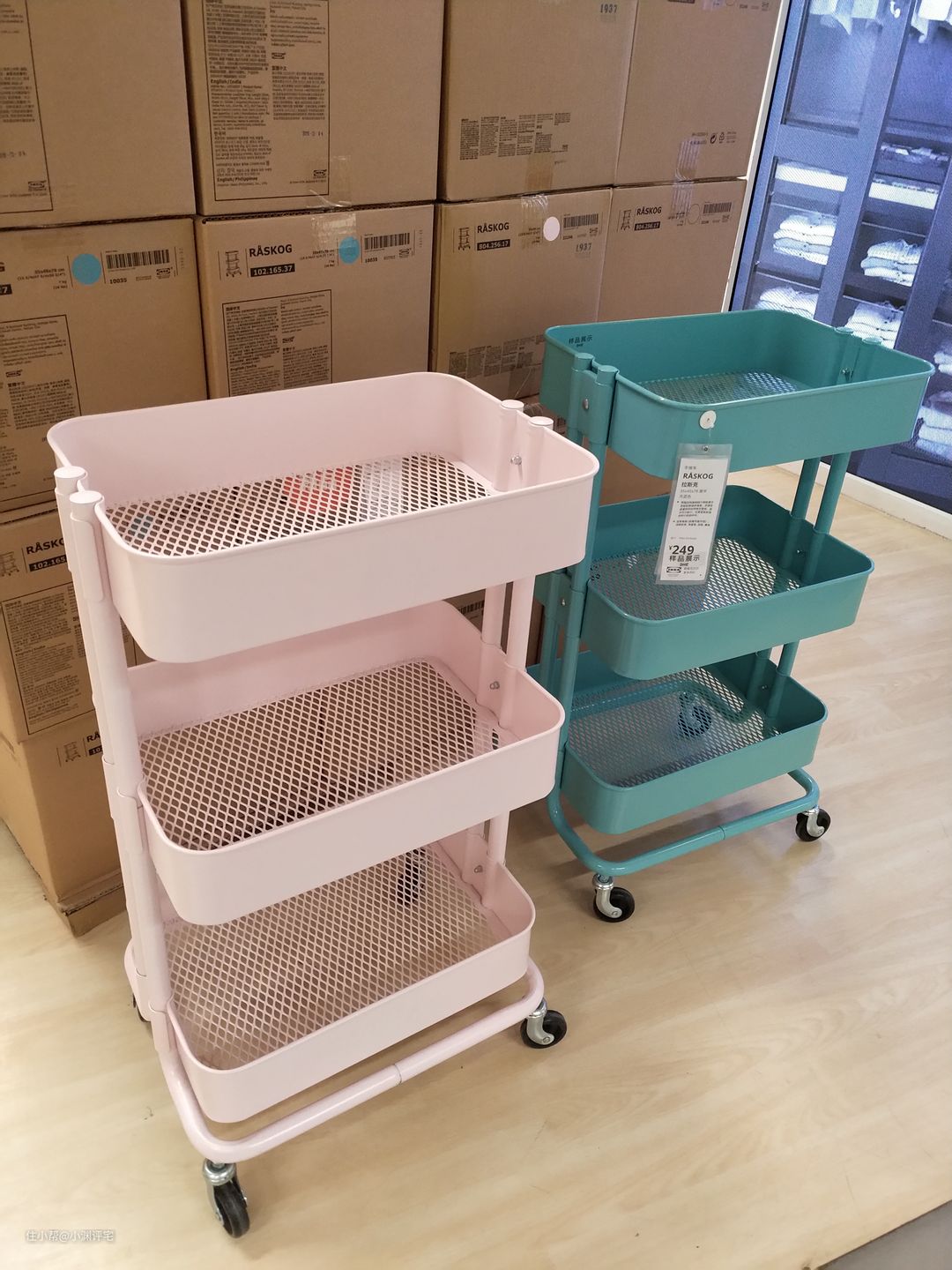 依然是宜家的网红单品,以简洁、便携为主的。不过放到家里以后发现不是那么回事,置物架有点用,但是下面的轮子成了累赘。每次推到一个地方,都需要弯下腰把轮子锁住。而且平时在家里使用,根本用不着推来推去。相比之下,简单的铁艺边柜似乎更好用,也更好看。