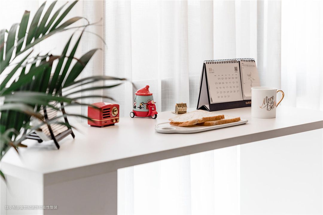 #客厅 #阳台宽1.2m,长3.5m,我们把这个空间分成了三个功能,其一作为常规阳台,猫舍置放在此处并可以养一些绿植;其二作为休闲吧台,定追极简的造型不会影响正常的采光;其三则作为办公区区域并设置了书桌,与吧台呈几何形状连接在一起,并充分利用转角区域,有效利用空间的同时,也增大了桌面的使用面积。