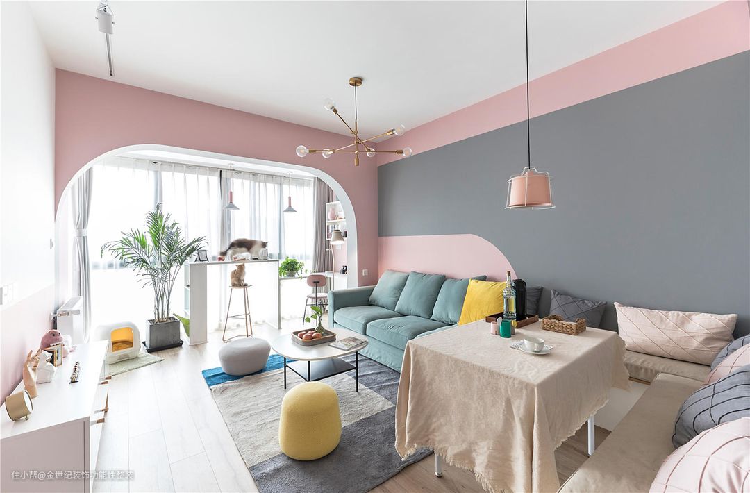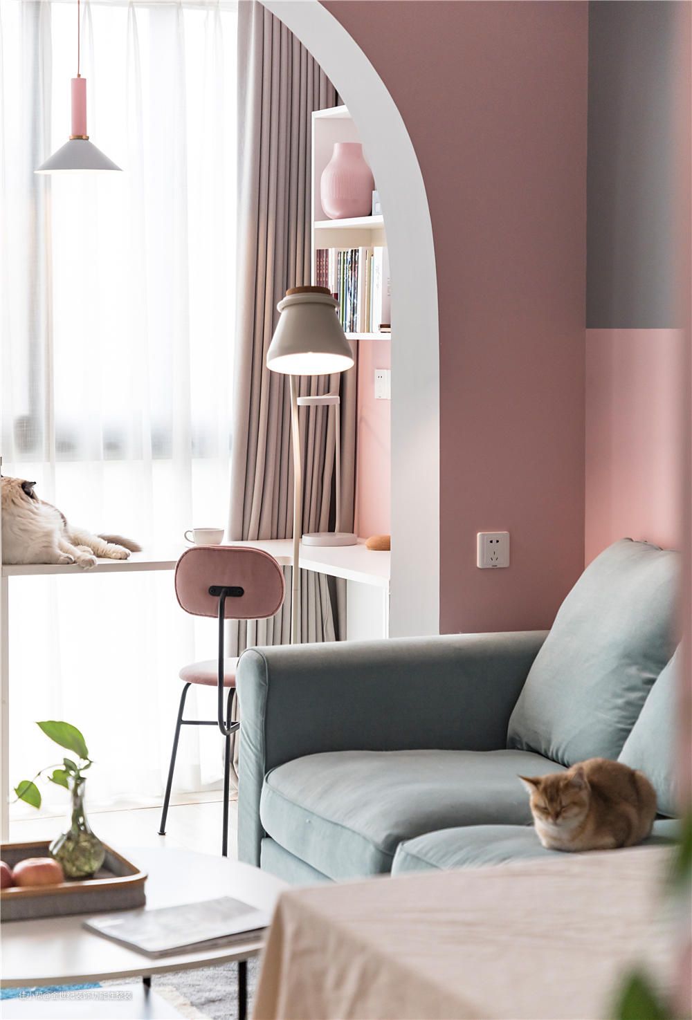 #客厅 #薄暮灰 、淡脏粉、 圆弧门,再与其他零碎元素相融合,筑造了这样一处猫与人共处的空间。
