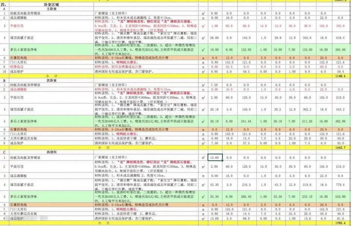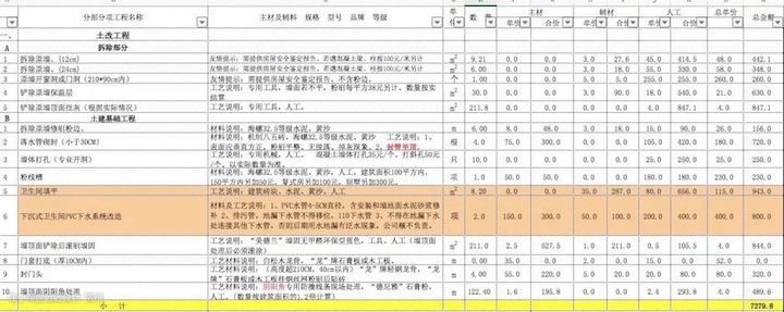 房子是几居室、几个厨房、几个卫生间、有没有衣帽间、杂物间等,每个空间都需要列出单独的一项来报价,这样更清晰明了,也能看出施工方有没有在面积上搞猫腻。