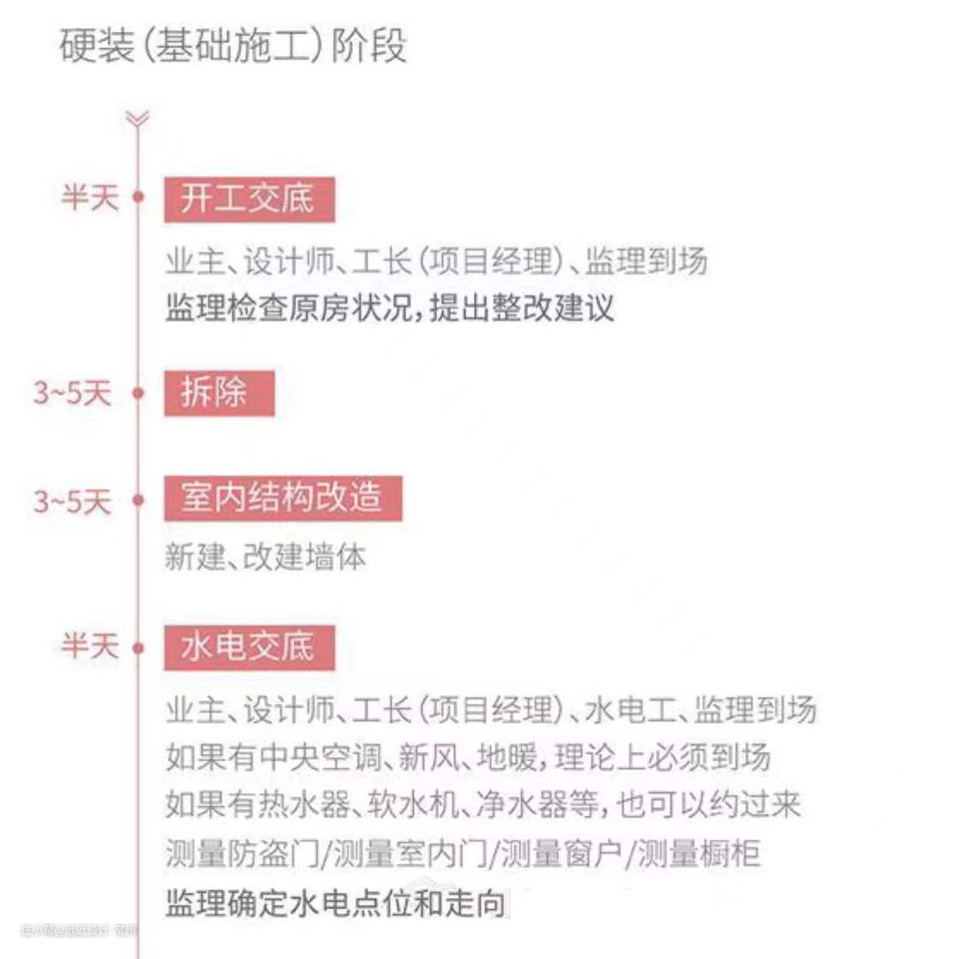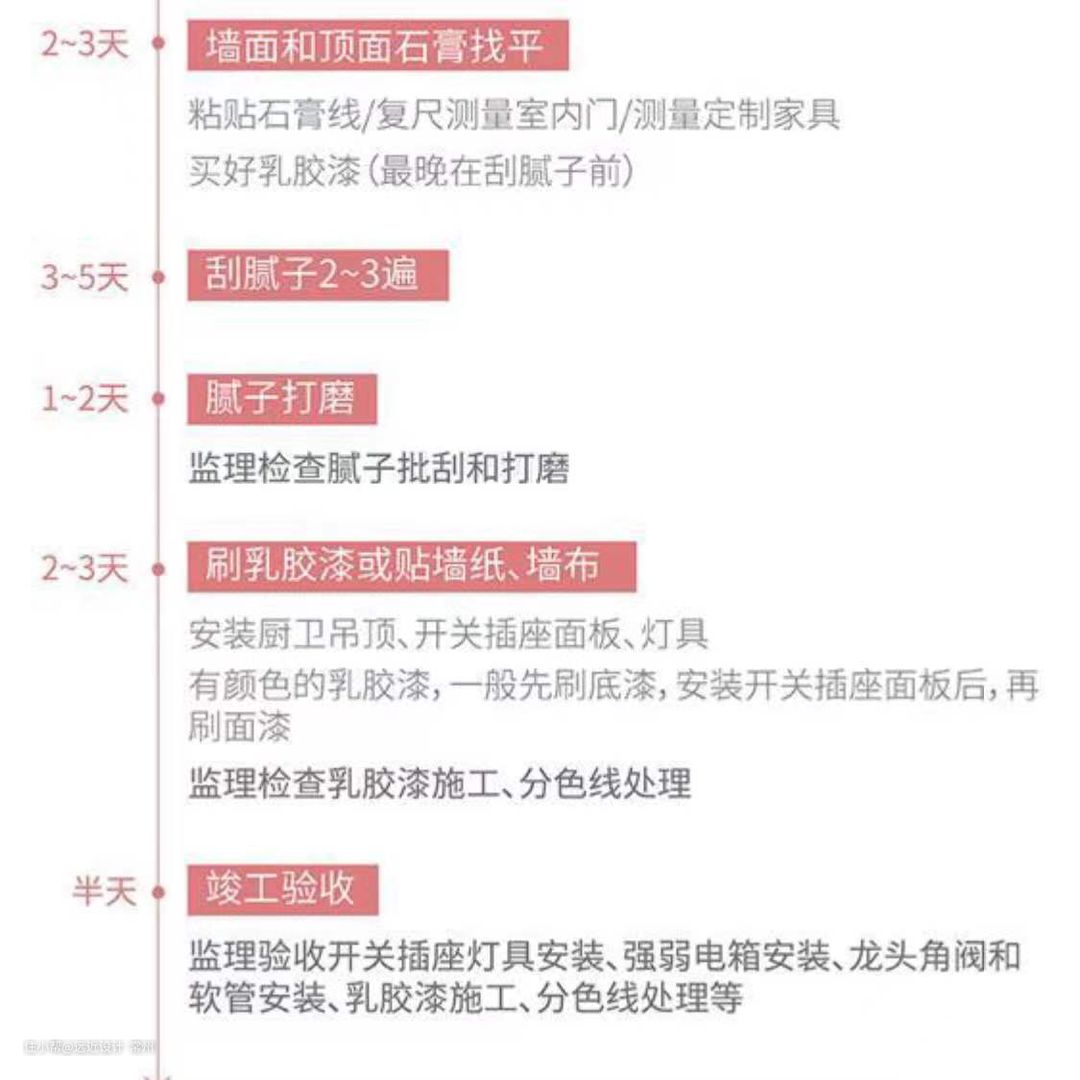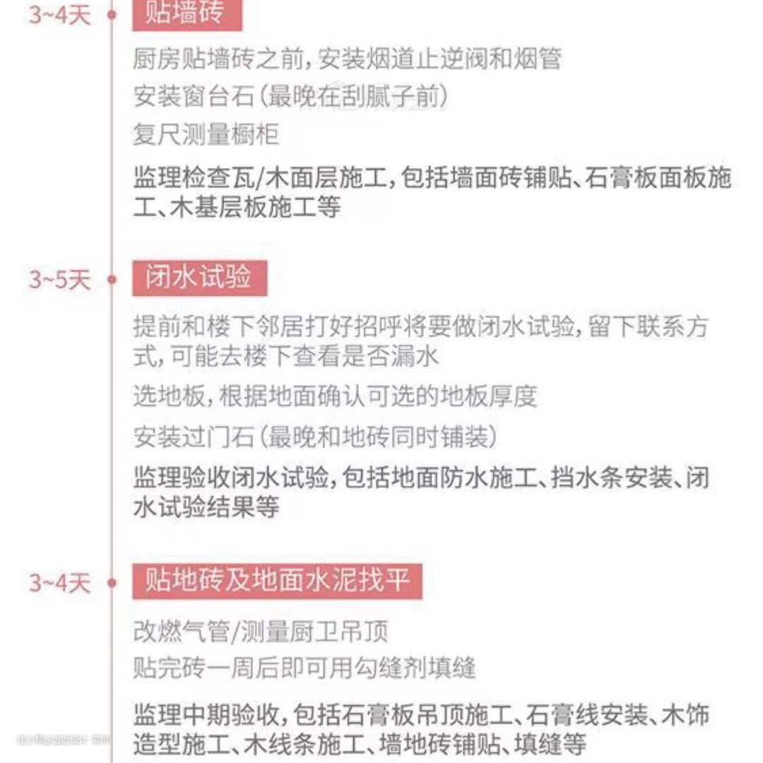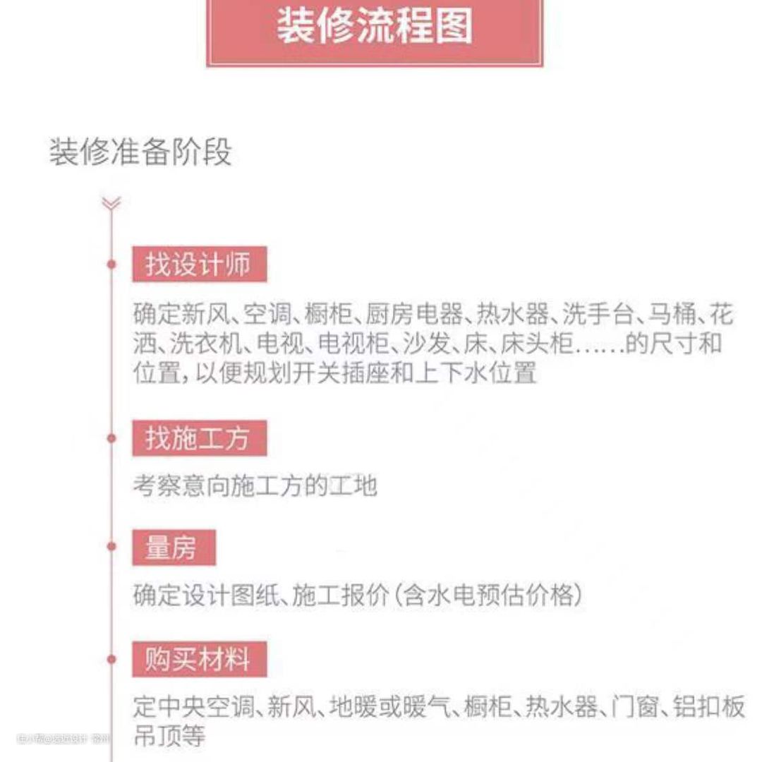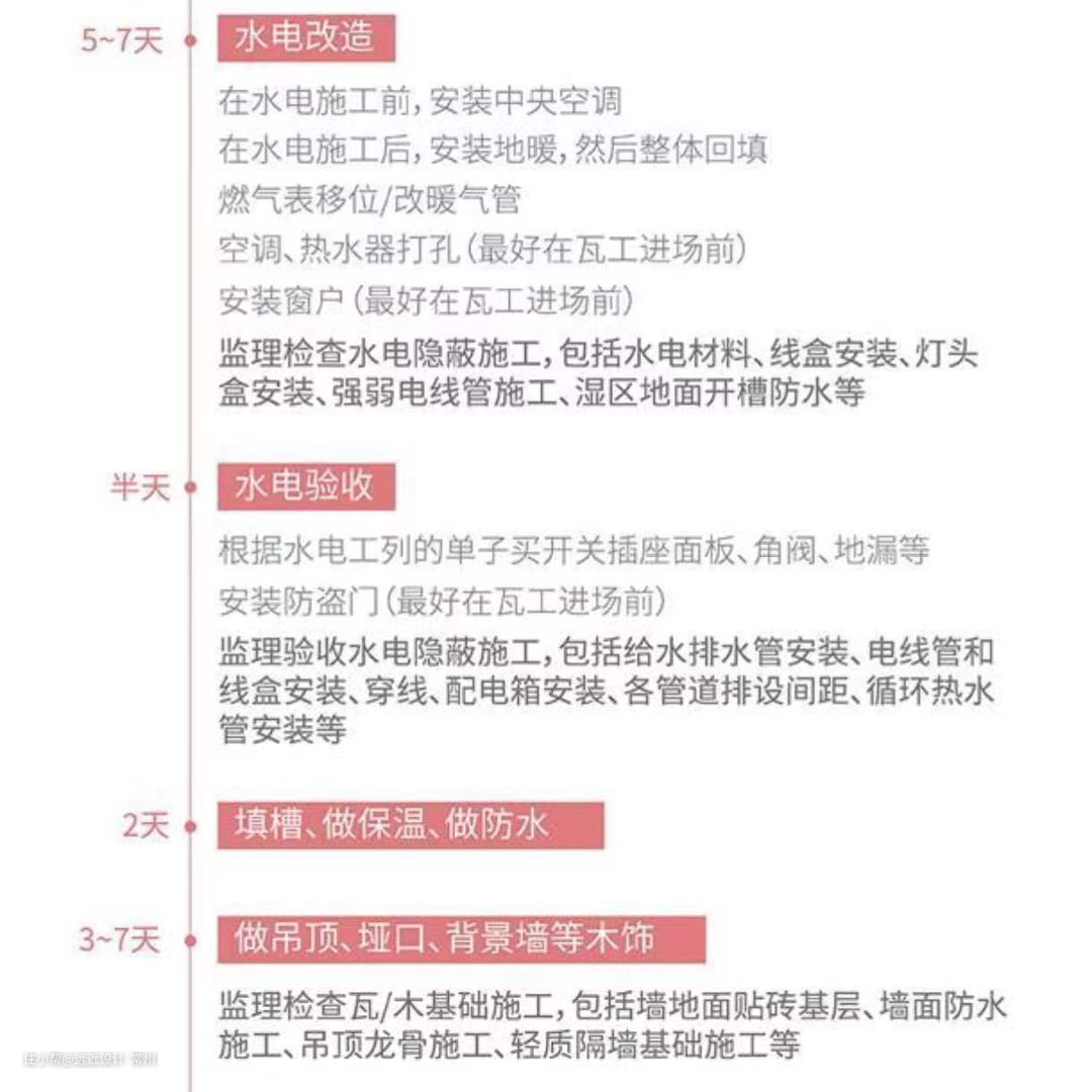 上面的装修顺序,不一定绝对准确,但基本涵盖了大部分家庭装修中会涉及到的项目,你可以参考上图,计划自己家的装修进度。