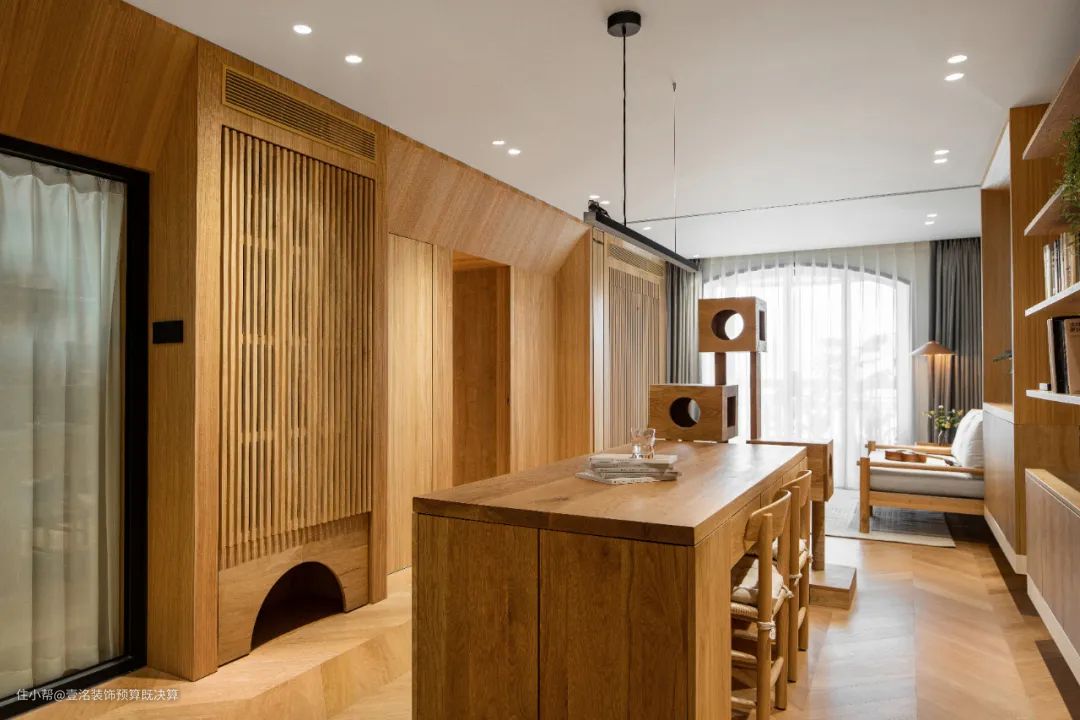 进门后就是这一整形似景框的墙和橡木大桌,屋主平时工作较忙观影需求较小,所以选择舍弃电视+沙发设计,大桌为中心,让客厅变成女主人的手工区。