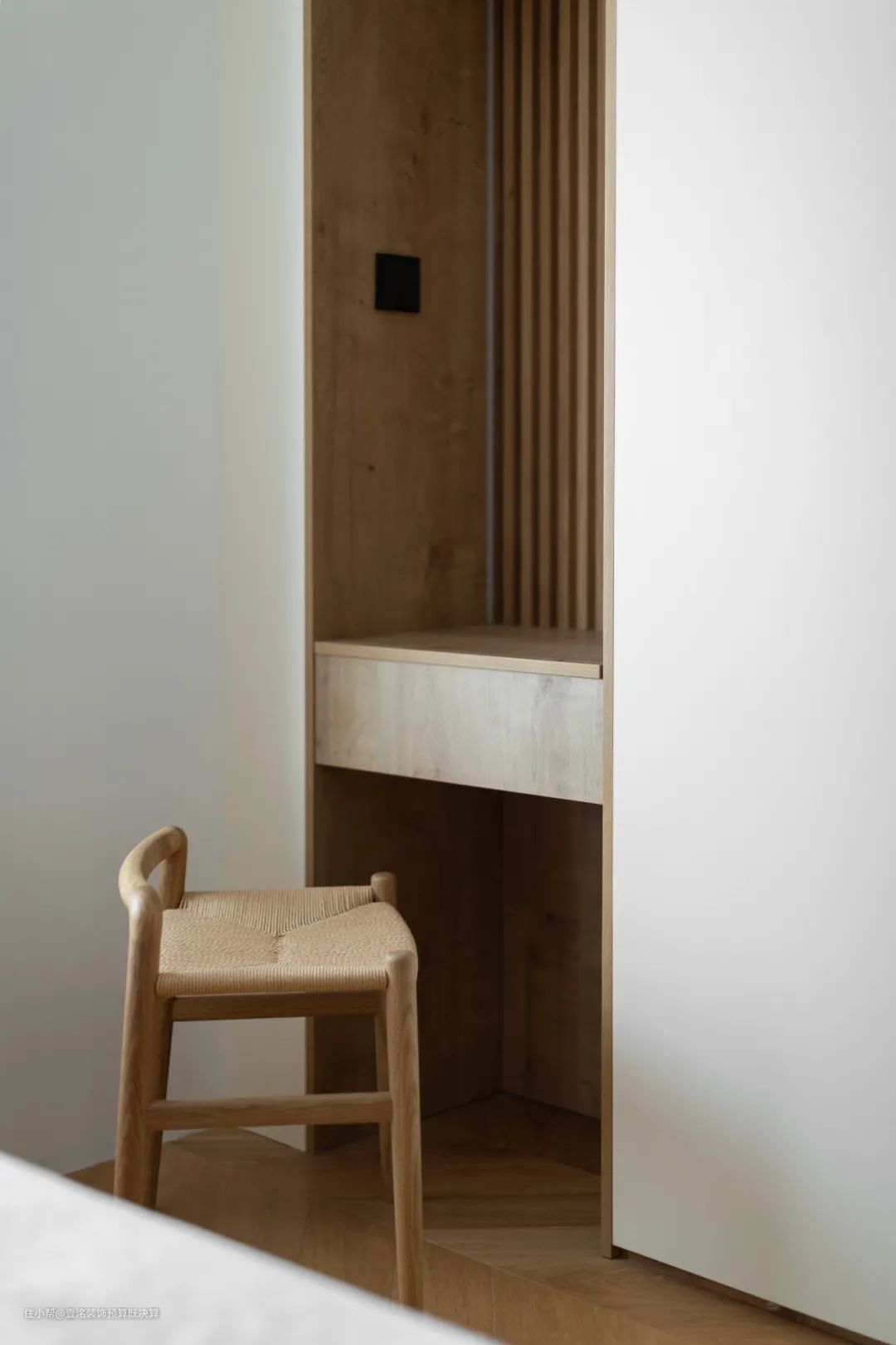 右边则是结合储物柜深度做的内嵌梳妆台,不占用空间的同时还起到了装饰点缀的作用。