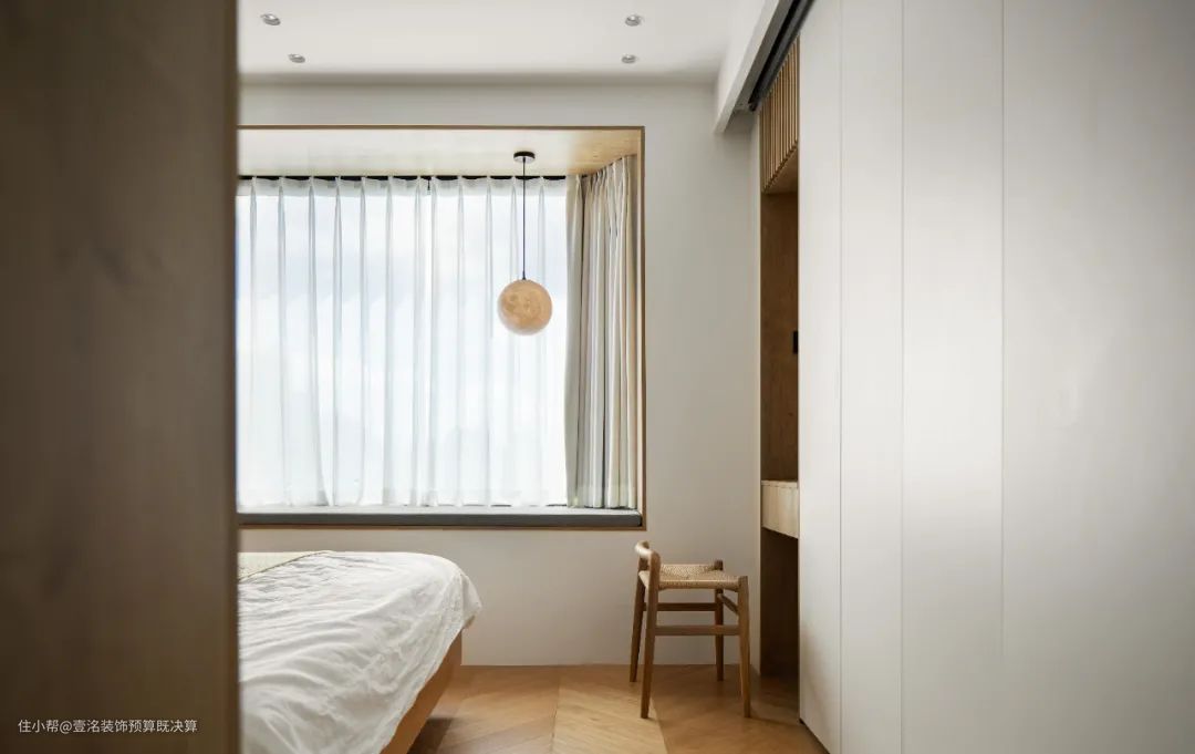 卧室飘窗用木板围合,悬挂上别致的月球吊灯,夜色中坐在飘窗上阅读也颇有情趣。