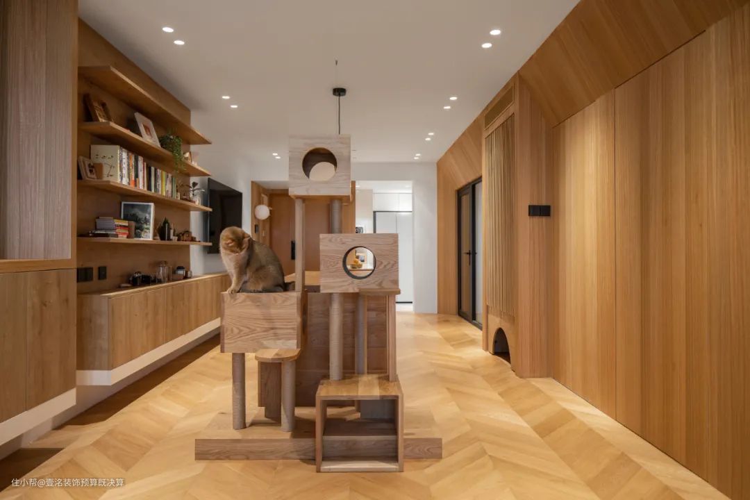 单独划出一个区域给猫使用,定制爬架以不同形式的盒子组成,满足了主子的运动需求。