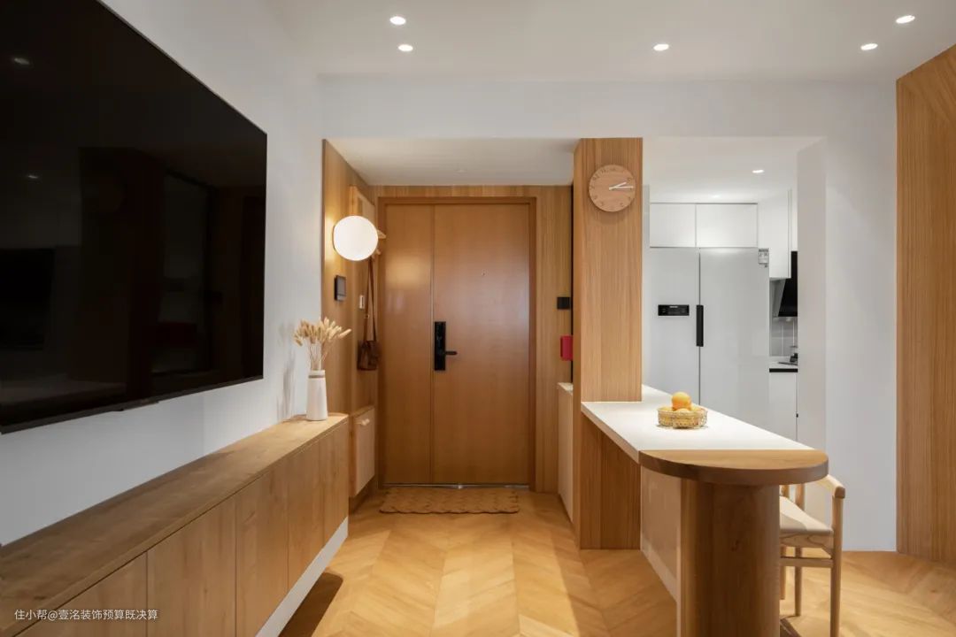 入户门选择的是和原木相近的颜色,靠左侧做木饰面,上面用洞洞板做收纳。