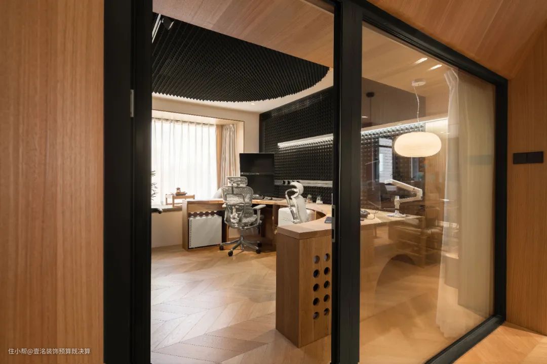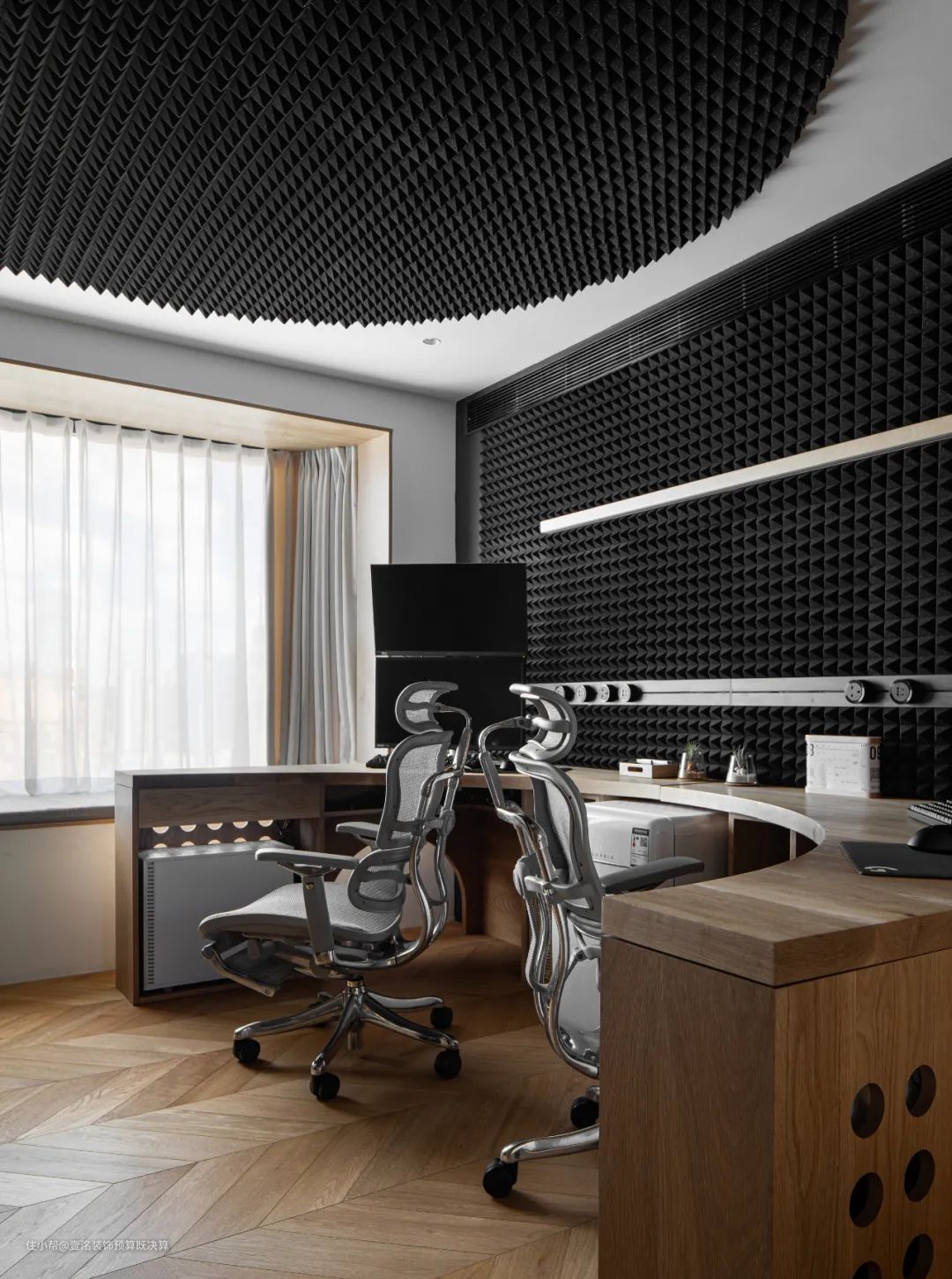 书桌对面的吸音棉墙上装一条灯带,顶面则做成了和下方半圆办公桌面相对应的弧形,在设计师的巧思下,黑色吸音棉也成了装饰,和整个工作室的气氛再契合不过。