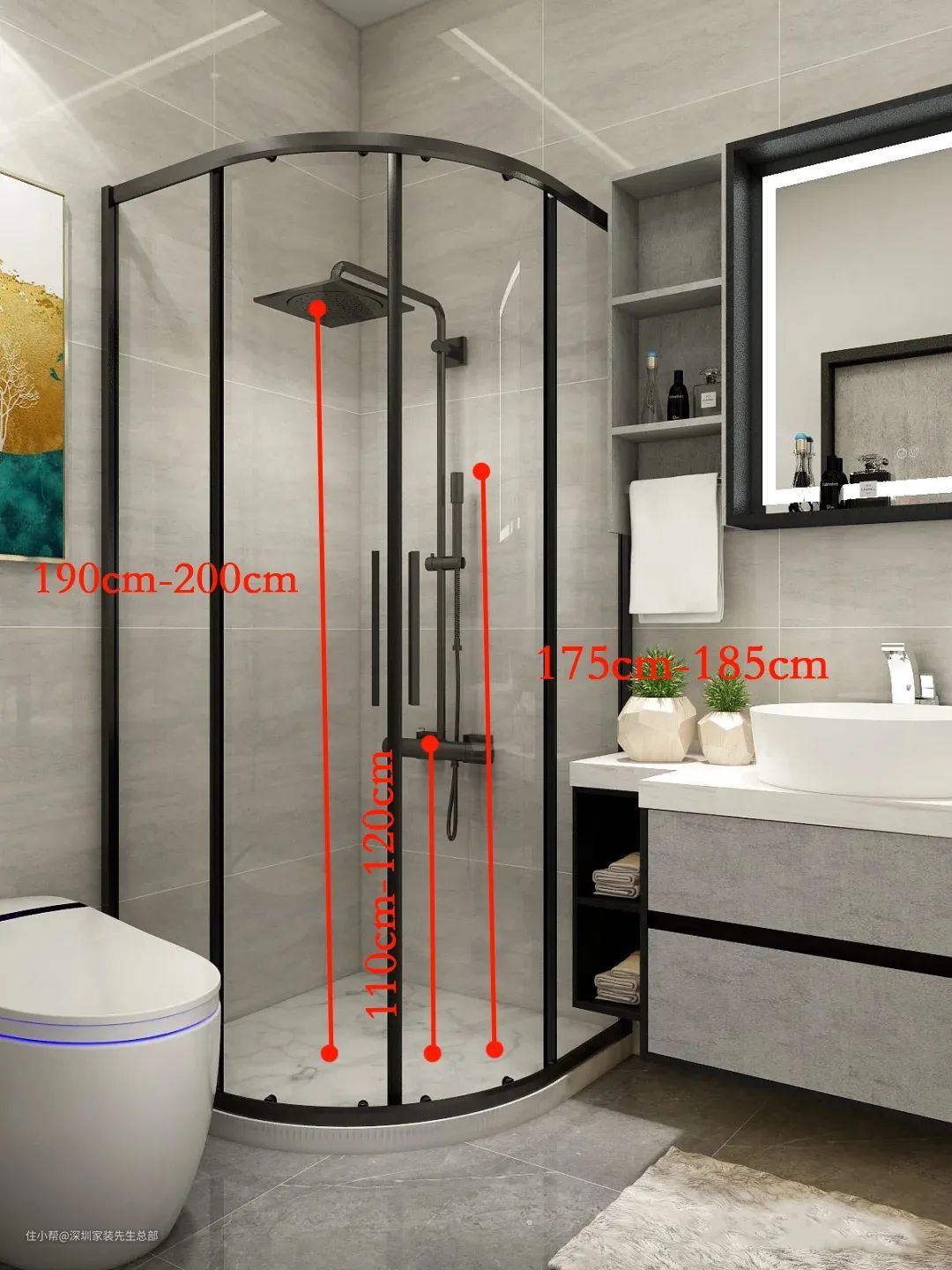 成人正常的淋浴间一般尺寸在90cm×90cm,高度是2m。