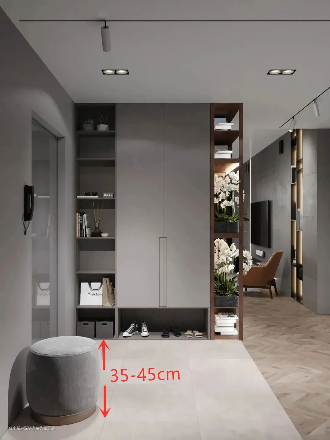 ——鞋柜与地面间最好留15~20cm空隙,便于日常换鞋脱袜