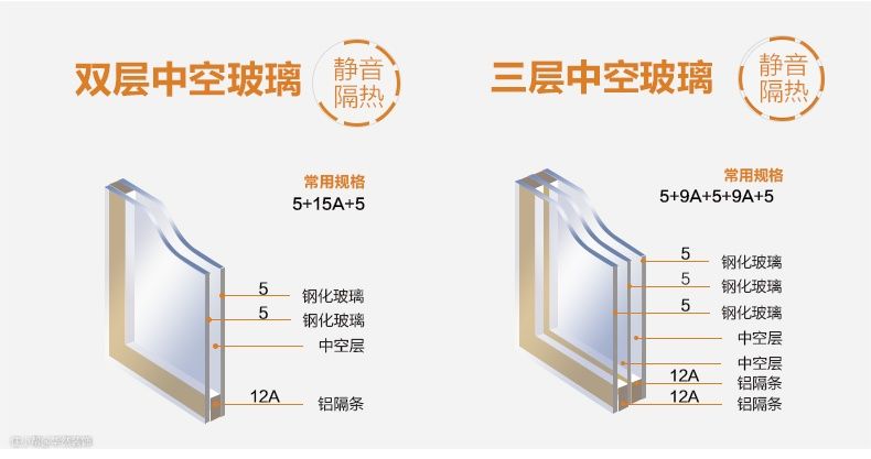 中空玻璃是两块玻璃之间充满惰性气体,两块玻璃之间的的宽度越大,隔音隔热性能越好,但不用特意追求。市面上还有三层中空玻璃,就是在双层的基础上再加一层,例如常见双层中空玻璃5+15A+5厚度(5是两块玻璃的厚度,15A指的是中间惰性气体厚度),三层中空玻璃5+15A+5+9A+5厚度(5是三块玻璃的厚度,15A和9A指的是中间惰性气体厚度)