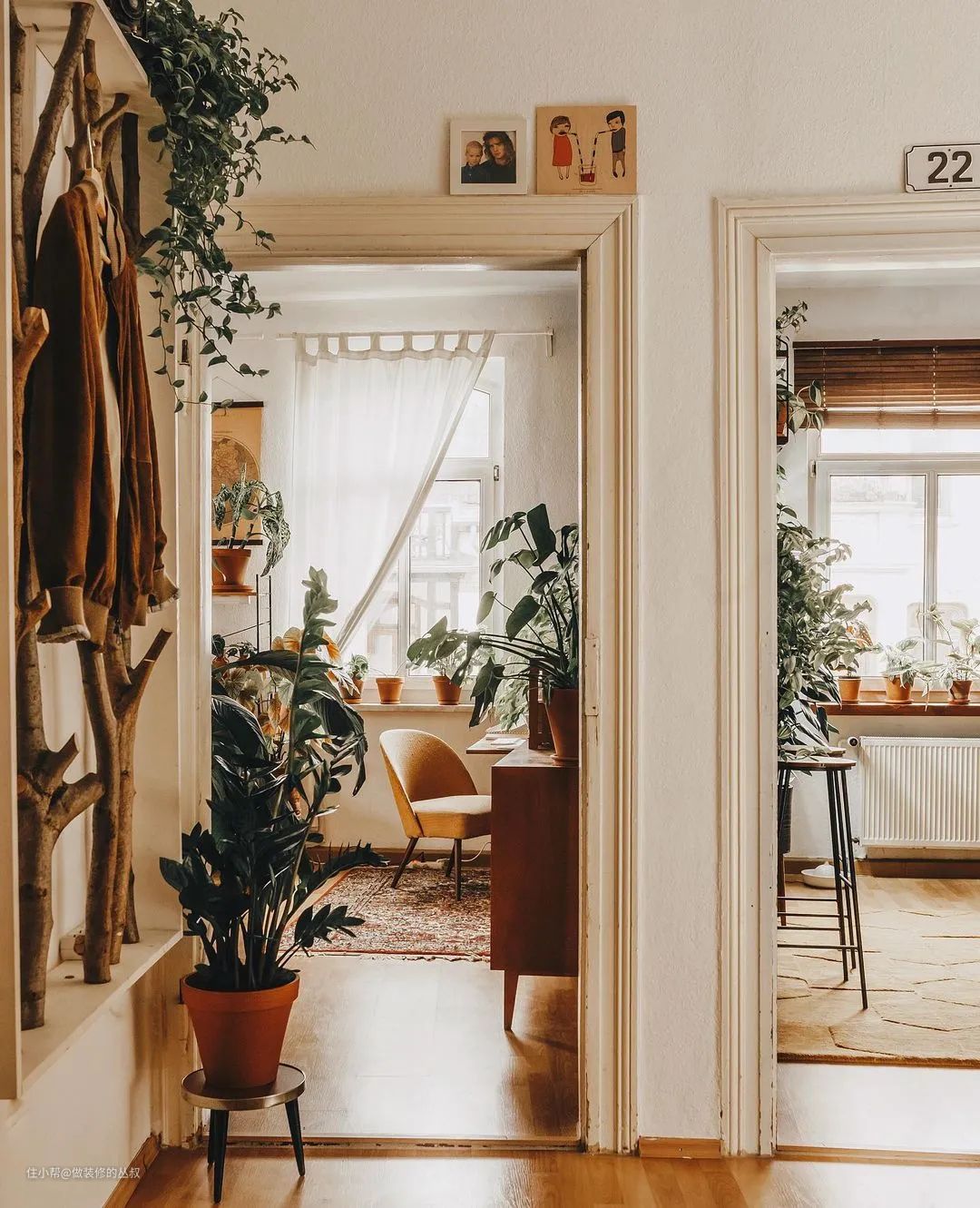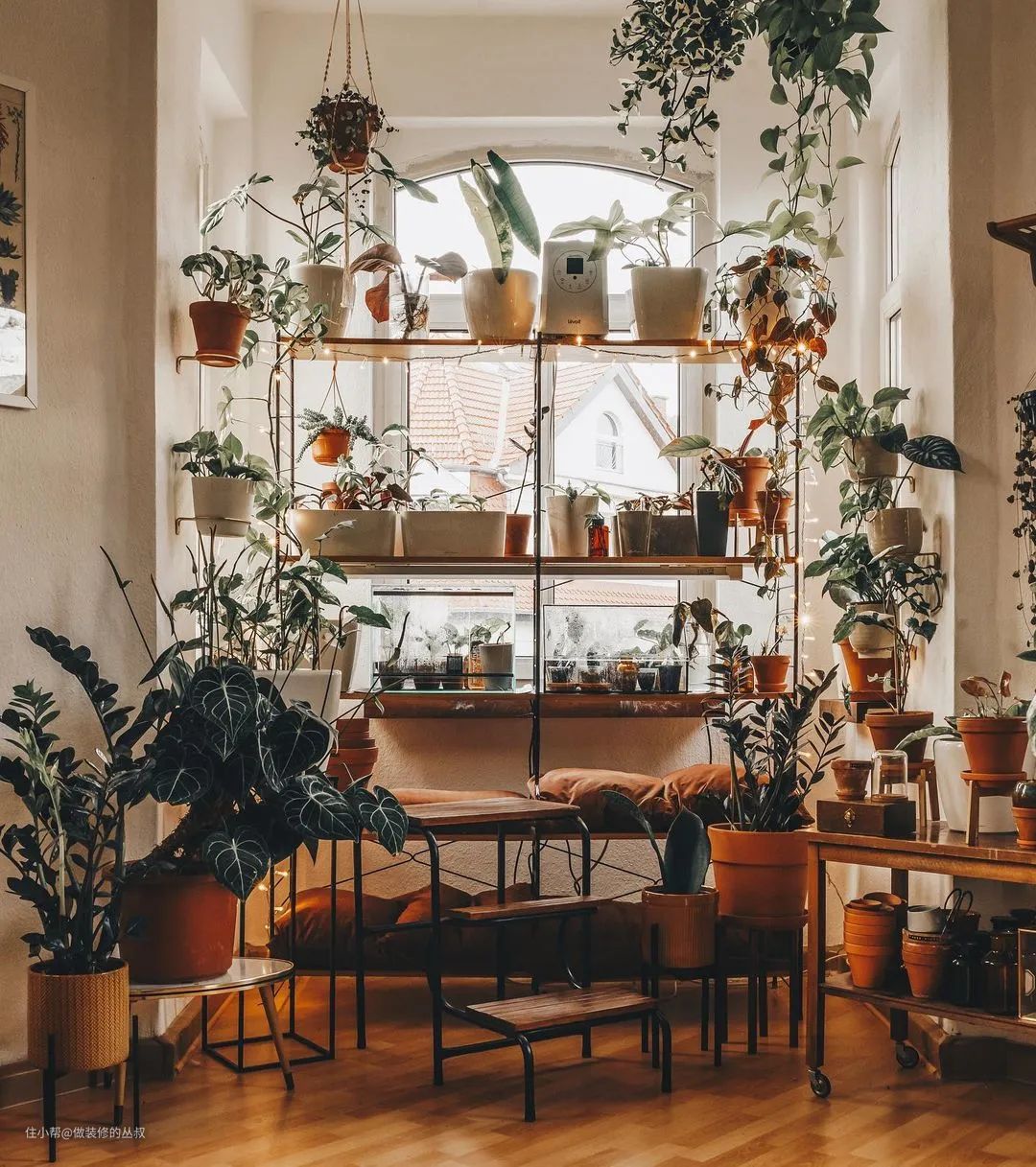 客厅里最大的亮点就是无处不在的绿植了。不管是墙面的置物架还是单独的置物架,上面都摆放了很多鲜艳的绿植,让人看上去就心情很好。