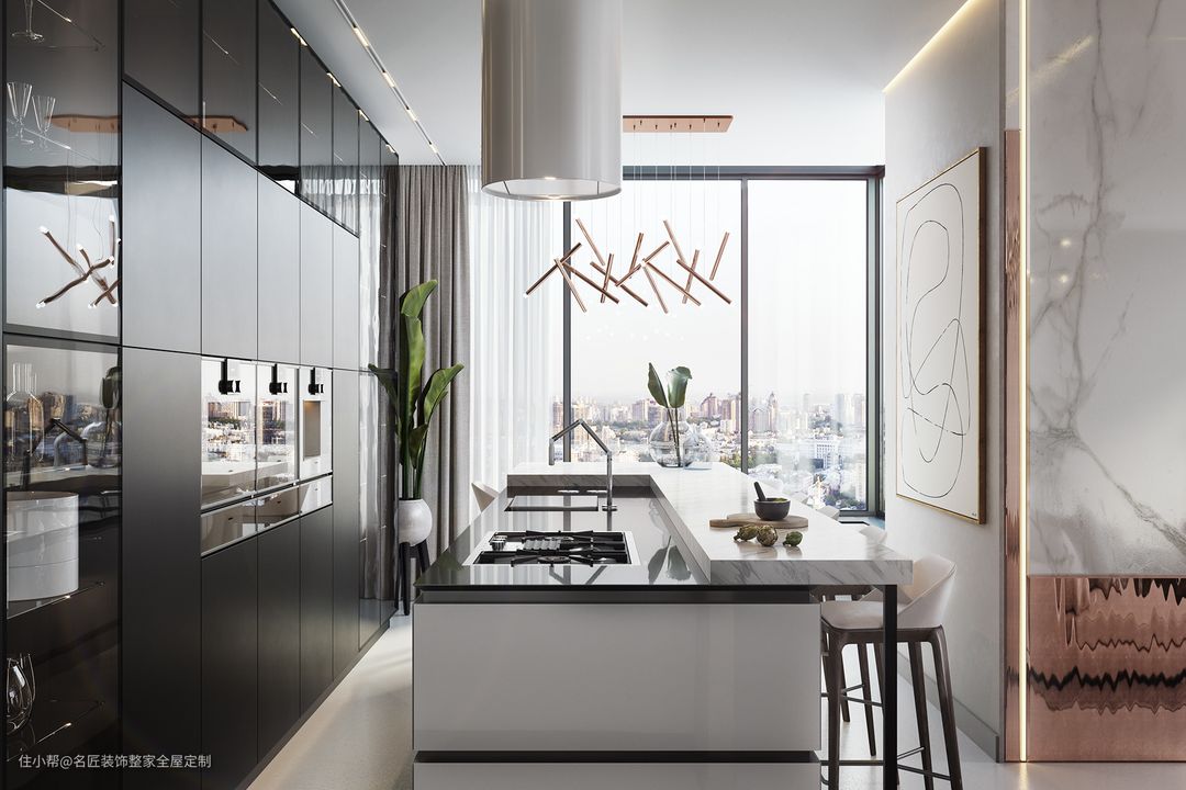 与此同时,因为集成灶是侧吸下排的排烟方式,烟管道走下方,因此整个电器的着重点位于地柜之中,很容易就能在纵向高度上占领优势,避免装修“头重脚轻”,实现纵向垂面上的宽敞,很多使用集成灶的厨房,在吊柜空间使用上比较自由,既可以选择不打吊柜减轻压抑感,也可以选择打满吊柜,形成“顶天立地”的宽敞感。无论怎么选,此时让房子空间显大都是水到渠成的事~