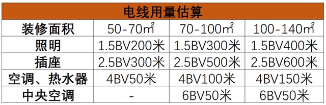 家庭装修需要用多少电线,可以参照下表: