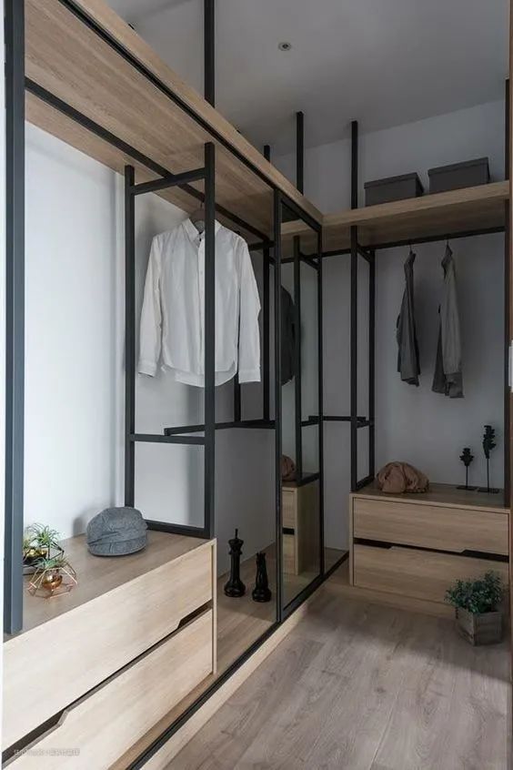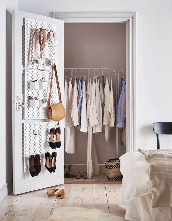 顶部放不常用的衣物、箱子,挂衣架可以挂一整排衣服,挂衣区底部可以根据需要使用抽屉、收纳盒,选择也很多,比如宜家艾格特。