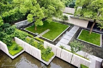 直线性的硬质铺装有助于分隔出花园内的空间区域,大大提升了实用性,功能分区一目了然。规律性的排布和小部分穿插,增添了庭院景观的韵律美和节奏感,简约之中包容万象。