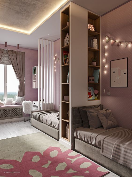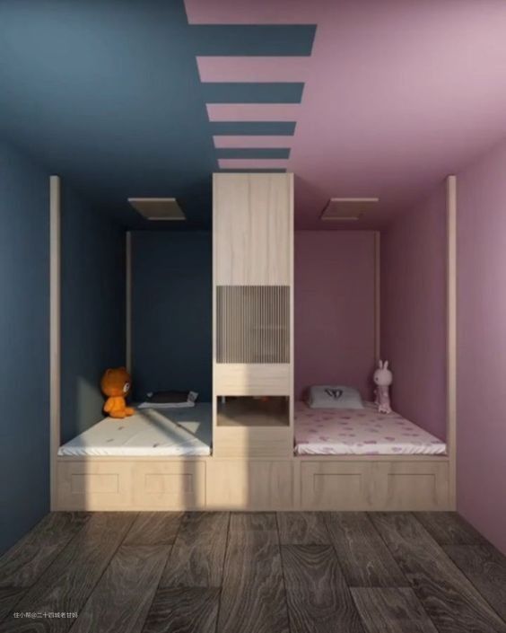 如果觉得打柜子太复杂了,也可以直接在一张床铺中间加个隔板,很适合小户型家庭。