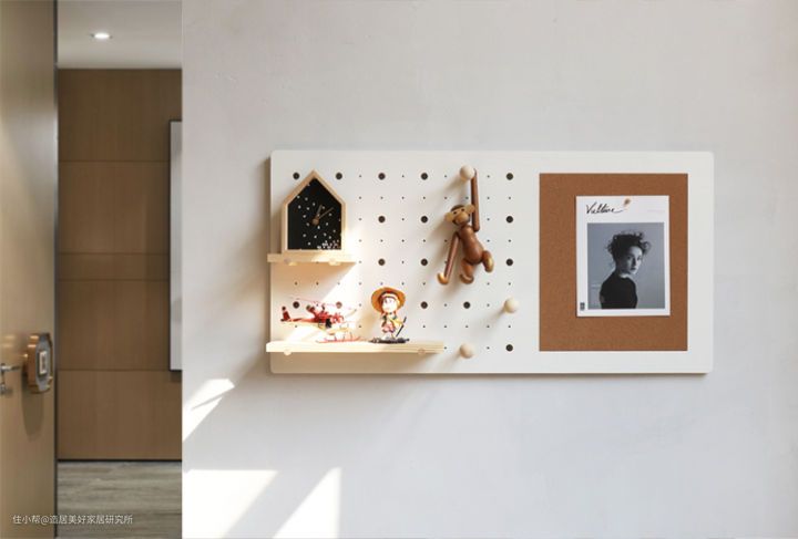 材质上,一块洞洞板可以拆分为两部分,左边是厚度为18mm的多层板制作,上面排布着做工细致的孔,右边则是嵌入了8mm厚的软木板,非常个性。