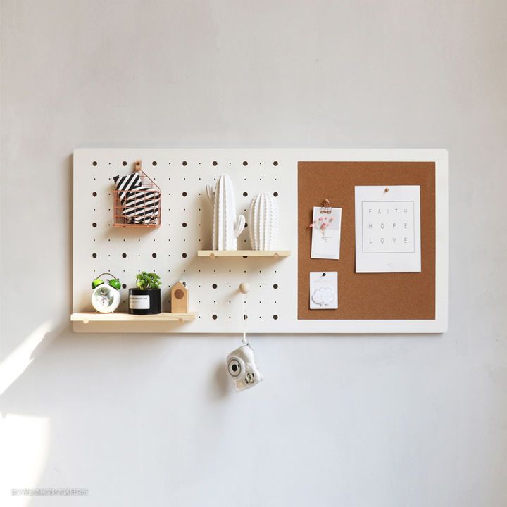 这款洞洞板造型小巧,颜值清新,有白色洞洞板搭配木色的组合,也有原木色搭配木色的组合,可配合不同风格的玄关挂置在墙上,做为装饰品使用。