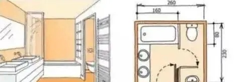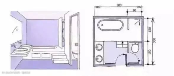 面积虽然很小,只有小小的3米,厕所依然能通过在浴缸与厕所之间的隔墙和单扇门设计成私密单间,为了使平面布局可行,这里需采用1.2米长的小尺寸浴缸。