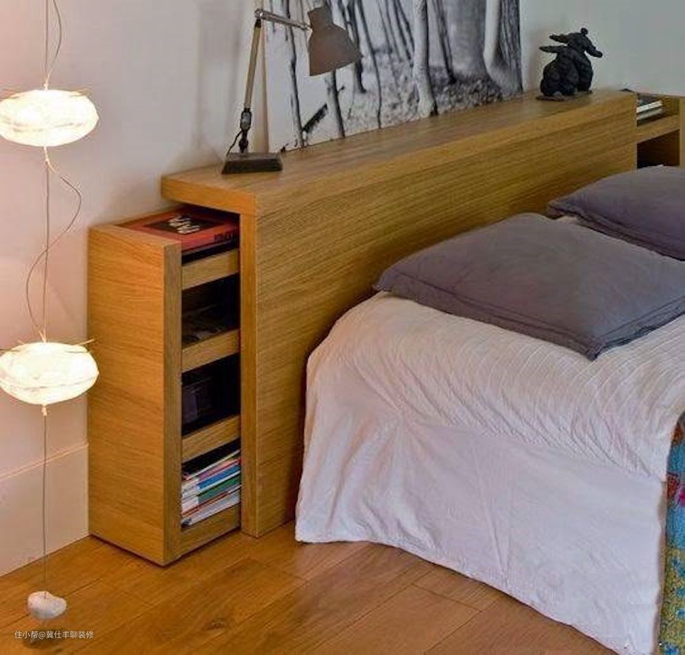 ▲ 这两个案例不陌生吧?简单说来就是将床身向前移动了10-30公分,床头后侧定制一组柜子,柜子内部可以收纳不少物品,同时,柜子上方也增加了不少储物空间,而且墙面上照样可以安装装饰画或者其它造型,当然,也可以像第一个案例一样,制作成抽屉的形式增加灵活性。
