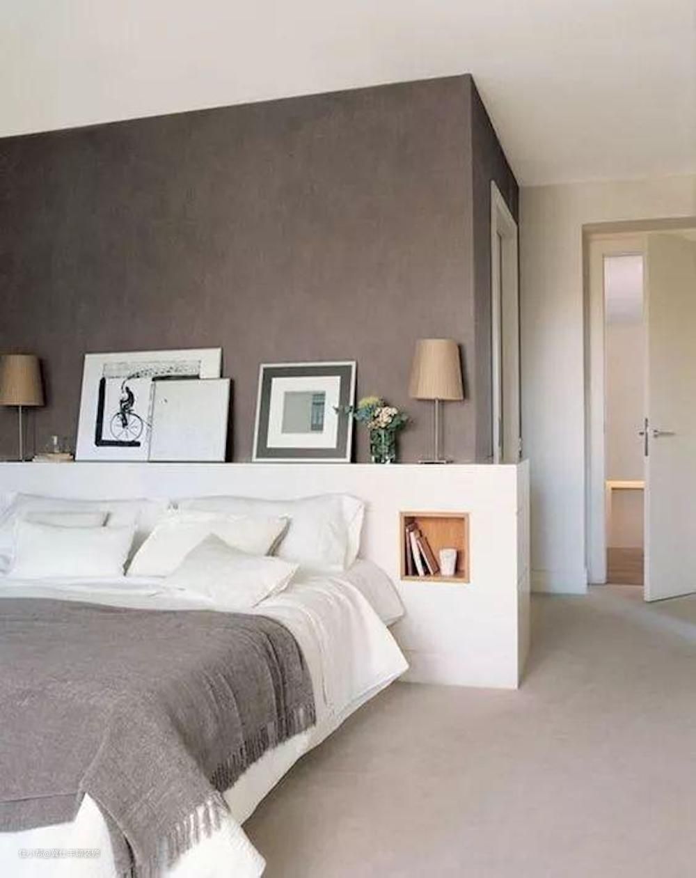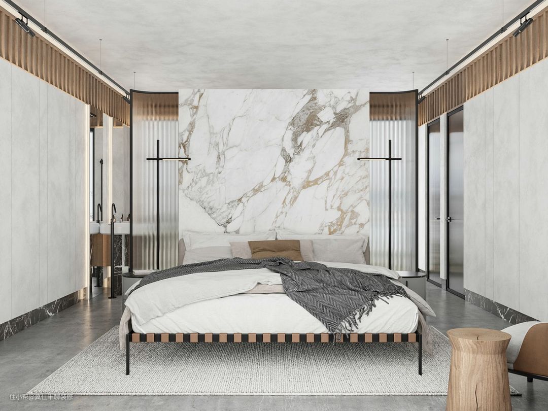 ▲ 严格意义上来讲,这两个案例早已脱离了“床头背景墙”的概念,此时,床头背景墙只是一个隔断而已,但床头后方的收纳空间更充足了,第一个案例的床头背景墙后面是一个卫生间,第二个案例的床头背景墙背后是一个餐厨区和衣柜!这样的案例会让大家脑洞大开吧?如果感觉自己的卧室偏大,有点不聚气,那么,采用这样的设计思路也是可以考虑的。