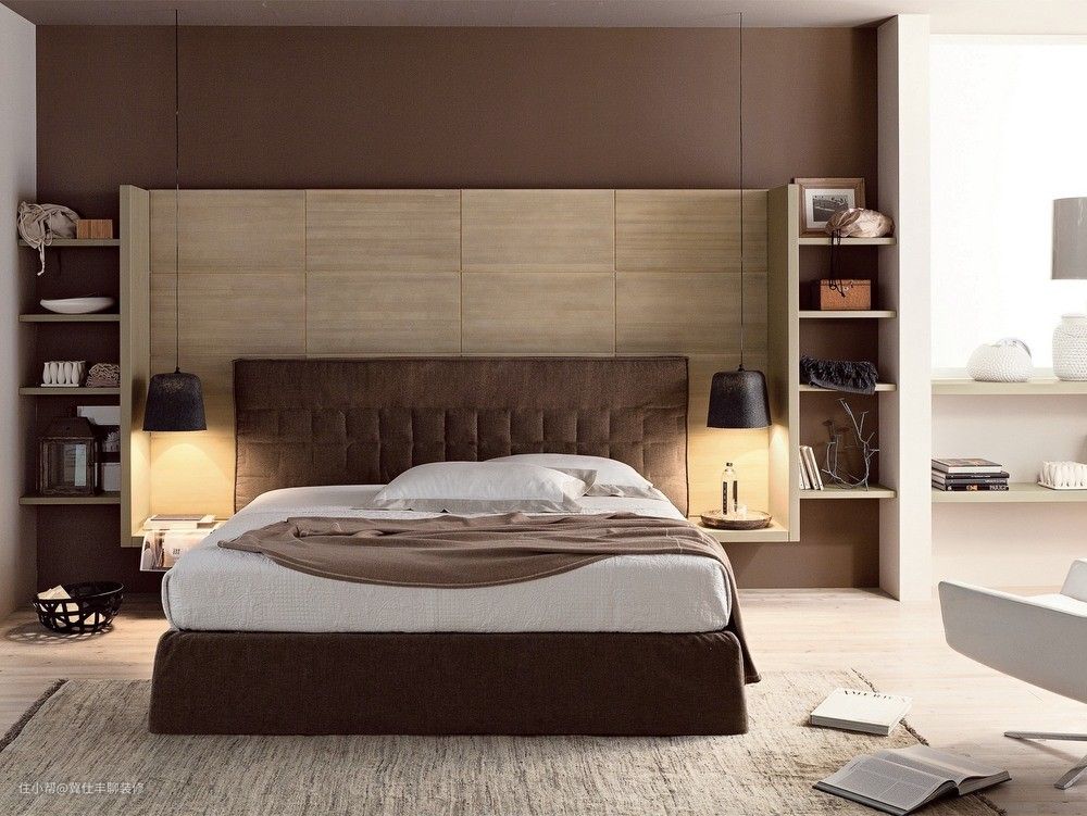 ▲ 如果空间允许的话,还可以在床头的左侧或者右侧定制一组柜子,让床头背景墙还保持一定的独立性,但记住一点:靠近床头的一侧,一定要设计成开放格,就像上面这两个案例一样,以方便从床上直接存取物品。