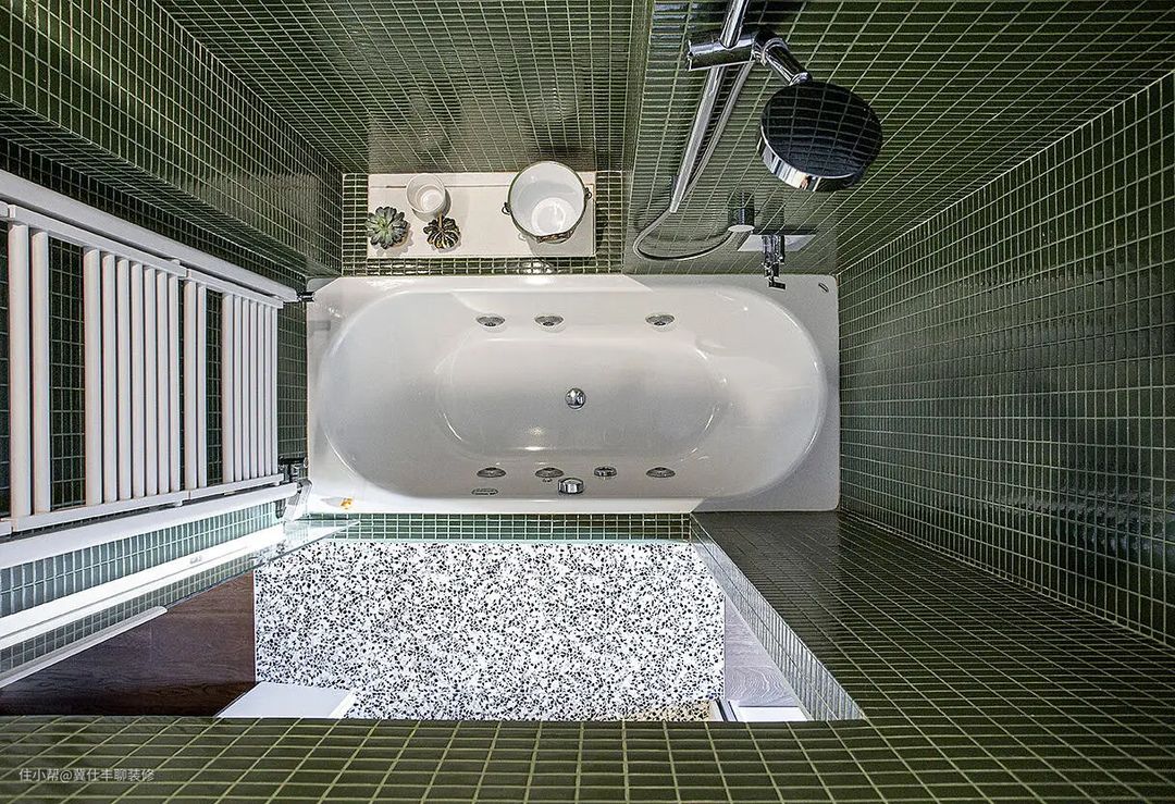 ▲ 主卧也被设计成了夹层结构,上层是卧室,下层则是休息区和工作区,让人眼前一亮的是,通向夹层卧室的楼梯选择了错步楼梯,也节省了不少空间,而且错步楼梯和夹层下方都有着充足的收纳空间。主卫分为两个区域,一侧是干区,安装了一个洗手台和一个壁挂马桶,另一侧是湿区,安装了一个嵌入式浴缸。