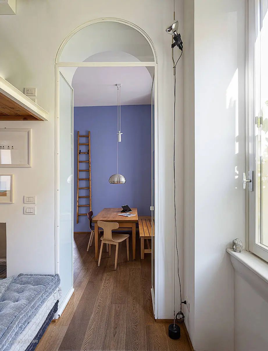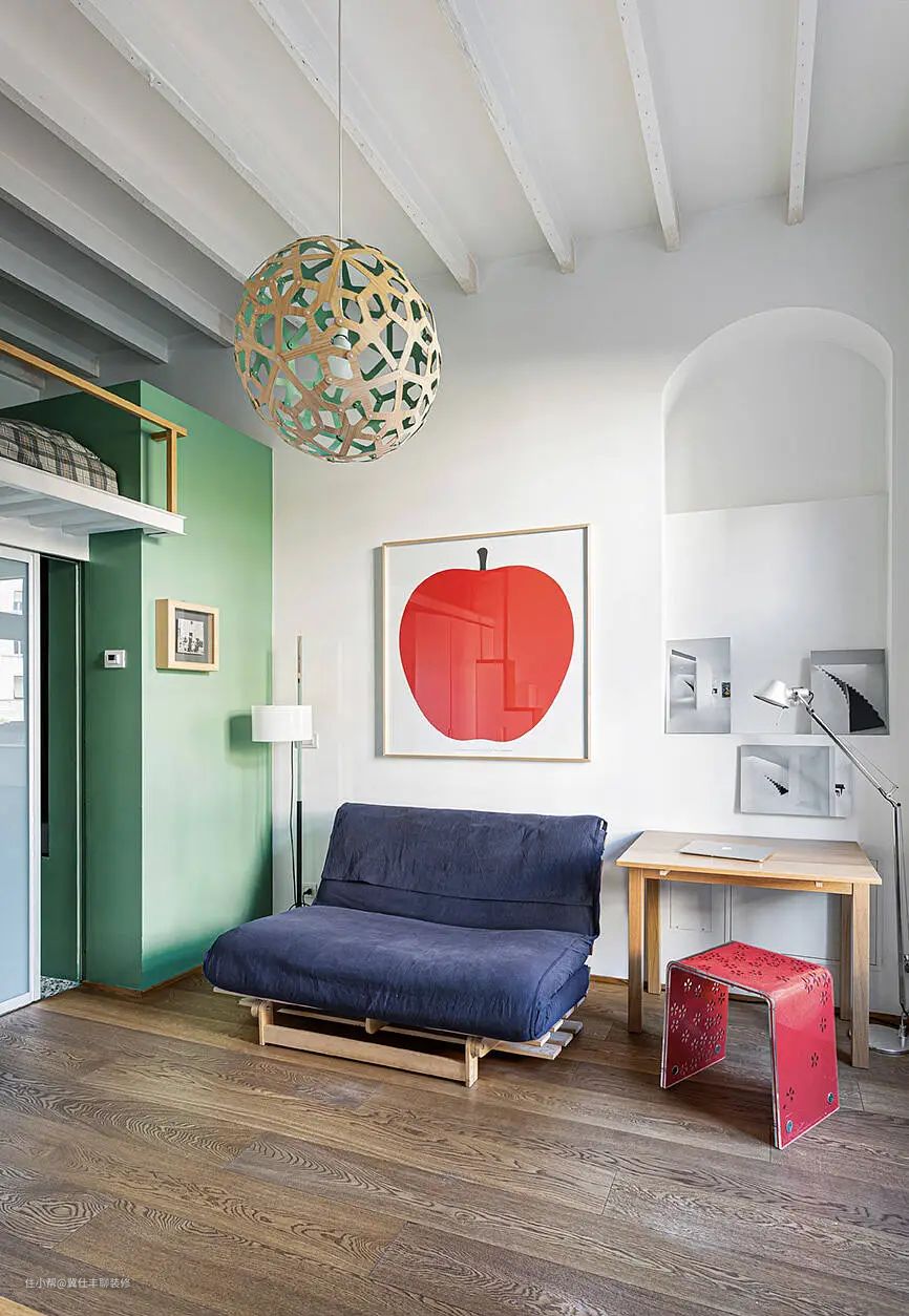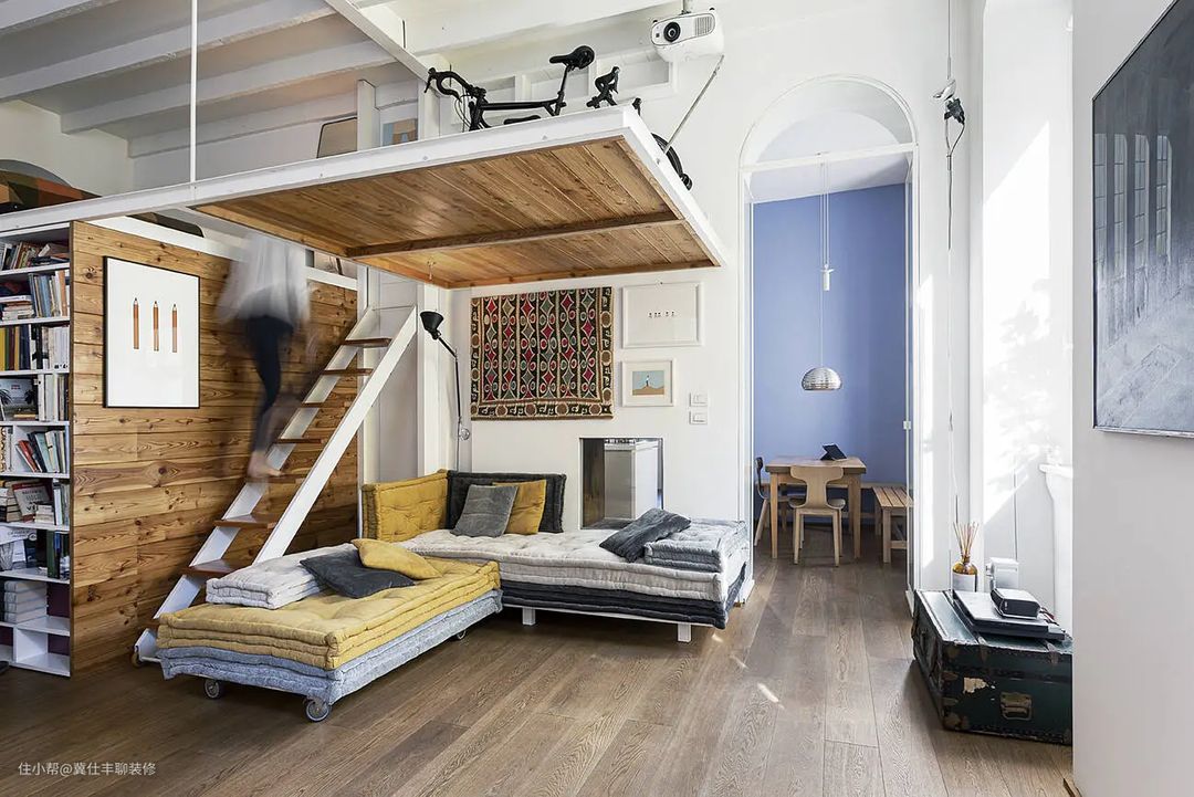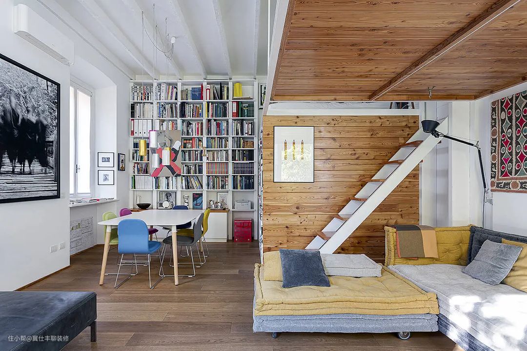 ▲ 进入客厅,就看到大量的开放式书架,里面摆满了琳琅满目的书籍。沙发位于夹层下方,由于是模块沙发,可以随意移动位置。沙发旁边则是一个伸缩楼梯,为上夹层提供了方便,平时不用时可以折叠到墙面上,不占用客厅空间。餐厅以书架作为背景墙,让餐桌同时可以兼做工作台使用。