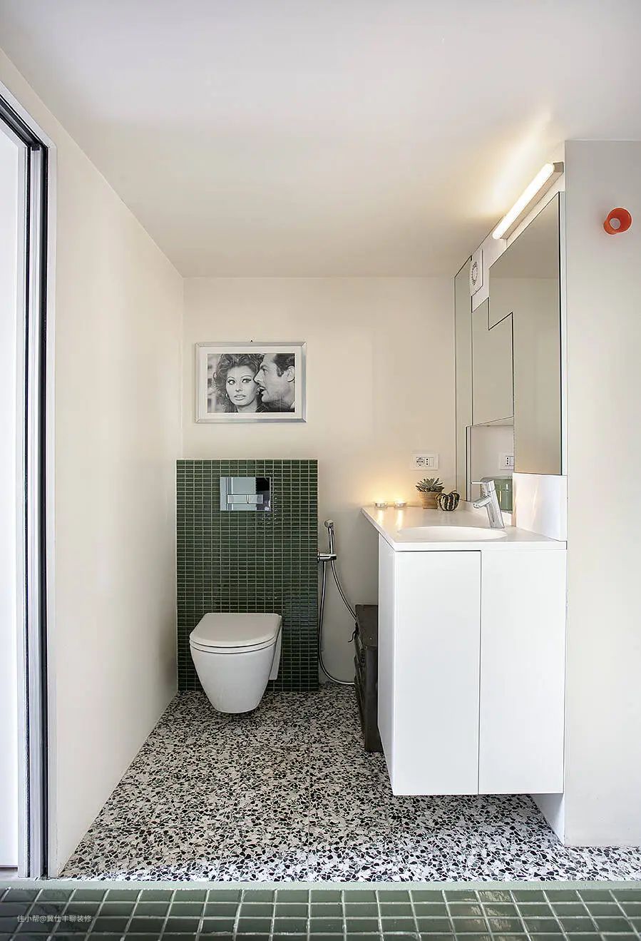 ▲ 次卫的设计选择了现代简约风格,洗衣机也摆放到了这个区域,另外,坐便器旁边的浴室柜设计成了开放式,以方便坐在马桶上的时候从里边存取卫生用品更为方便。