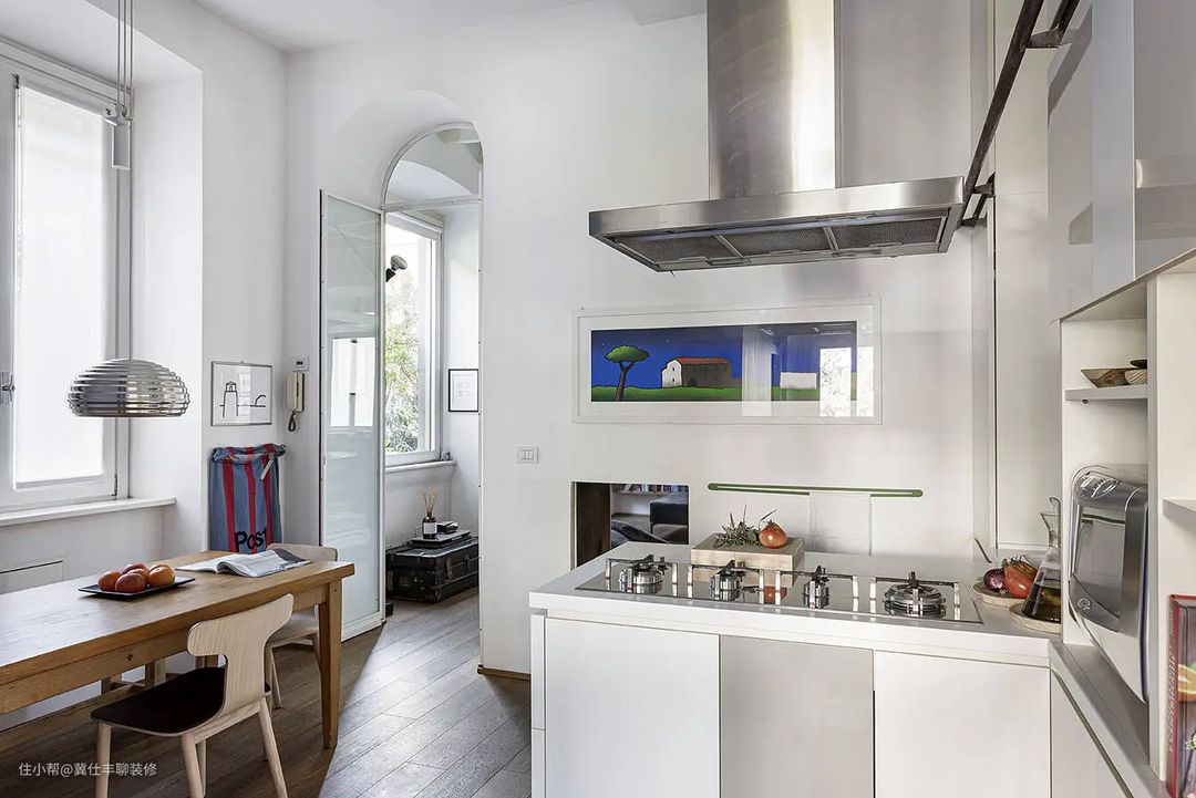 ▲ 厨房位于一个独立的空间,并安装了两扇透明玻璃对开门,里边还摆放了一张长条形餐桌,临墙位置摆放一个长条凳,可以让餐厅显得更宽敞一些。