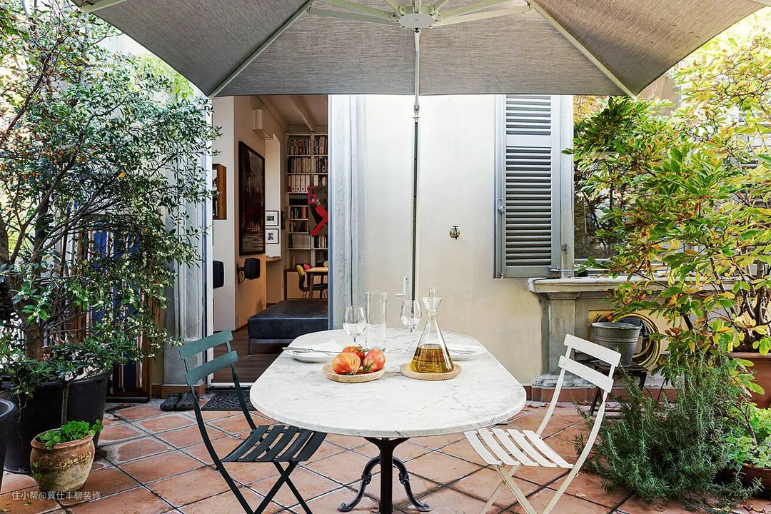 ▲ 室外的庭院种满了绿植,一把遮阳伞,一张餐桌,两把户外椅,简简单单就让这所LFOT公寓拥有了世外桃源的逃逸感。