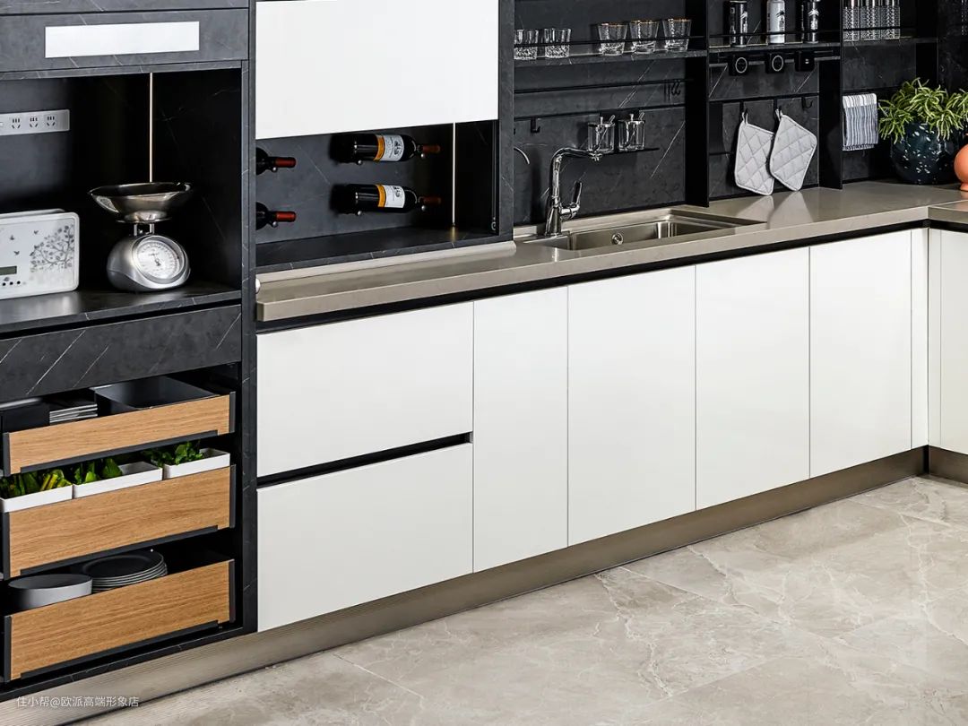 如欧派家的可拆装不锈钢水槽柜,采用0.4mm厚花纹不锈钢,底板两边均贴有防水胶条,具备超强防水防潮性,平时清洁容易,看上去还十分精致美观。