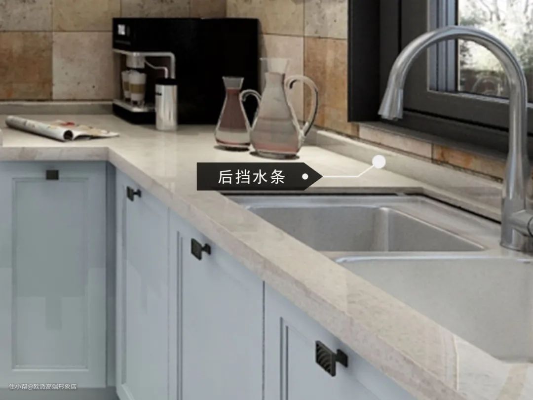 为了防止台面上容易积水和推积油烟灰尘等,可以在台面加入后挡水条,目的是避免缝隙积水,也更加方便日常的清洁。