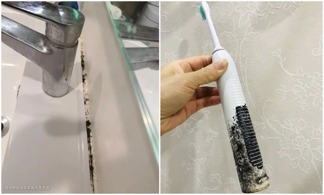 我们在马桶底部开业看到了毒菌,类似的玻璃胶模具也出现在很多地方,如厕盆与墙面的连接处、厨盆与台面的连接处、台面与墙面的连接处,甚至冰箱、洗衣机等水家电的密封圈都有毒菌。