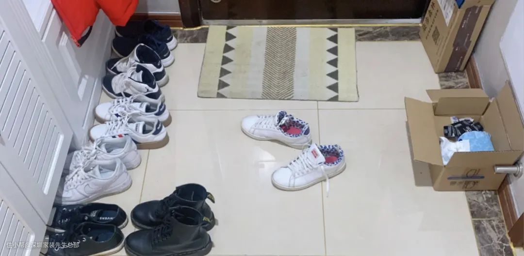 这一幕并不陌生。回家换拖鞋后,懒得把户外鞋放在鞋柜里,就把它们放在门廊门口。而且总有一些家人,第二天换了一双户外鞋,前天还懒得收拾。虽然有时他们会打扫干净,看起来干净整洁,但入口的正常情况如上图所示。
