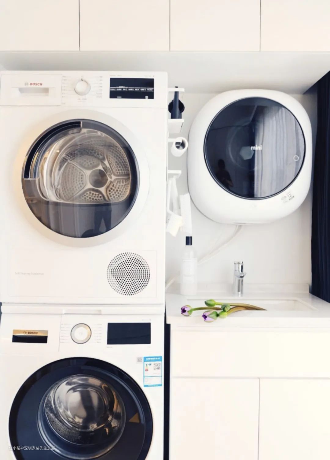 最终的折中方案是,烘干机负责大批量衣物烘干,晾衣杆,要的小的可隐藏的好看的解决偶尔的手洗问题。