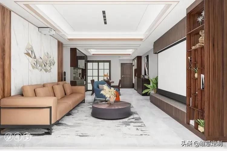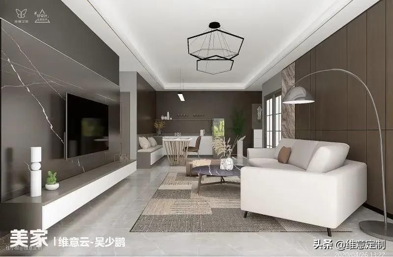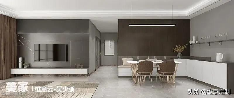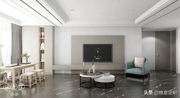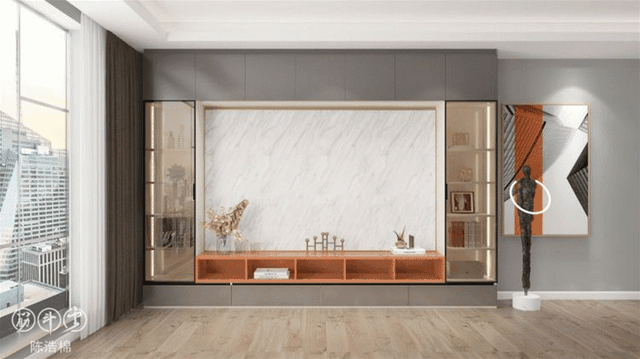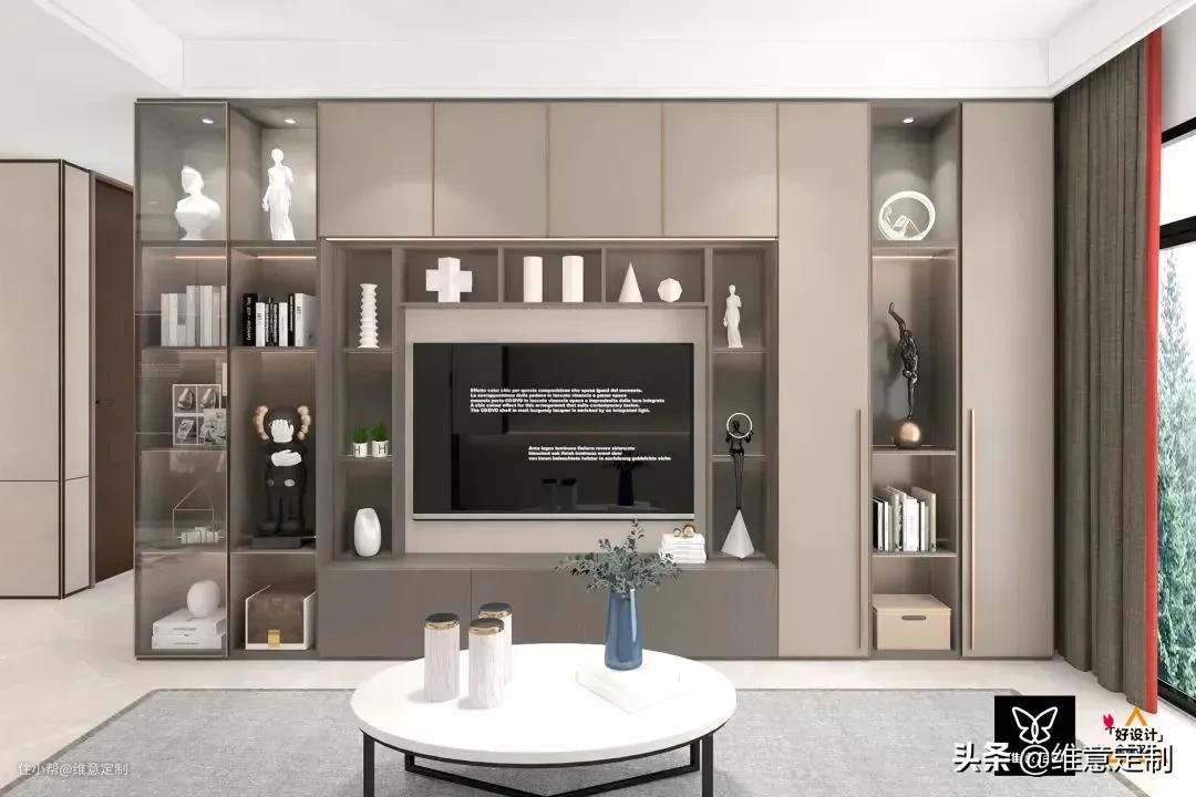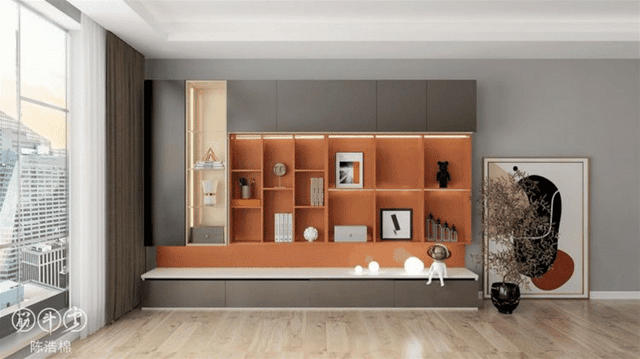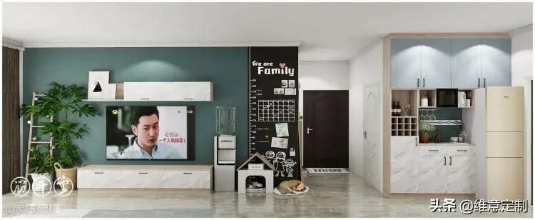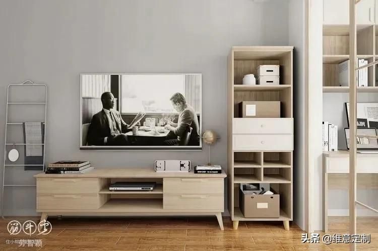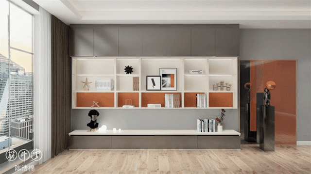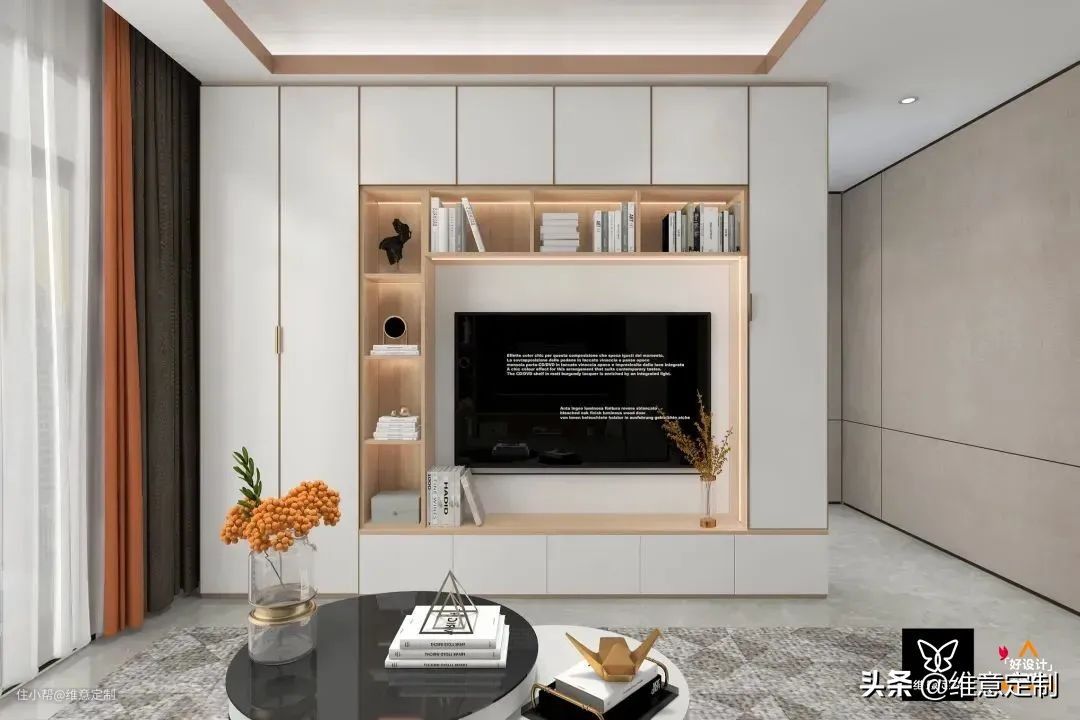 ▲整墙柜子需要注意的是“二八原则”,露二藏八,避免整面墙带来压抑感的同时能保持干净整洁,降低清洁压力。靠近电视一圈做成展示柜,摆放一些装饰品、书籍或植物都可以,外围则做成储物柜,塞多少东西都不怕乱,方便实用。