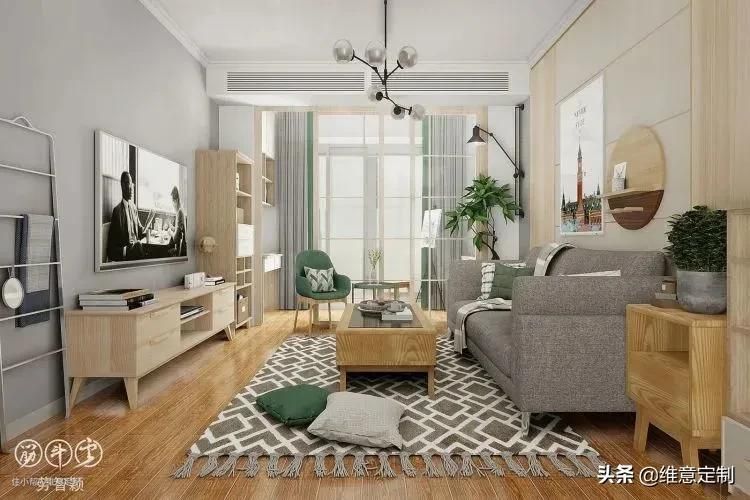 ▲北欧风客厅的背景墙选择百搭的纯高级灰,不加任何其他装饰。同样打造高低组合柜,与全屋家具统一风格原木色设计,让人觉得自然舒适。