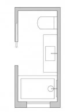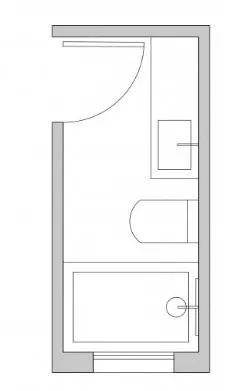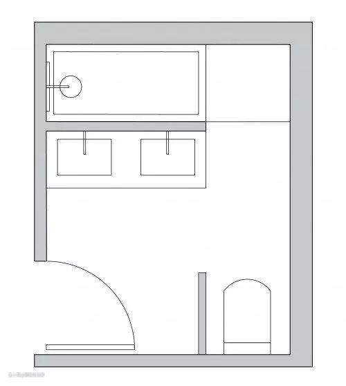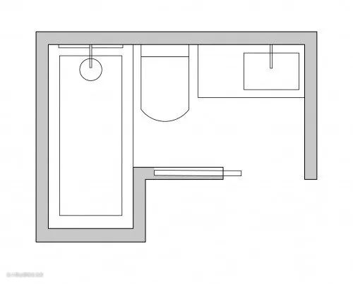 3,有时,开门会在L型底部的角落里。在这种情况下,我们的布局会和长而窄带侧门的浴室差不多。洗漱台正对入口处的角落,然后沿墙分别是马桶和浴缸。这时候的浴缸就有点小了。