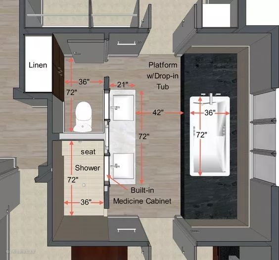 方形的卫生间倒是有更多的可能性:门可以是角落或中央,浴室可能有也可能没有窗户,等等。甚至,浴缸淋浴还能彻底分开了…这意味会有更多选择。但无论如何,我们还是可以找到一些基本准则: