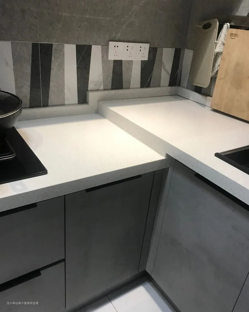 屋主去市面上的大品牌橱柜看了一圈,基本都是用颗粒板,3m套餐配一些贴牌的烟机灶具,价格动辄上万元。屋主最后选择了奥地利进口的爱格板,不限制颜色,品牌2cm石英石,送三个抽屉一个拉篮,配百隆阻尼铰链。水泥灰色,表面略有凸起花纹,有岩板的感觉。