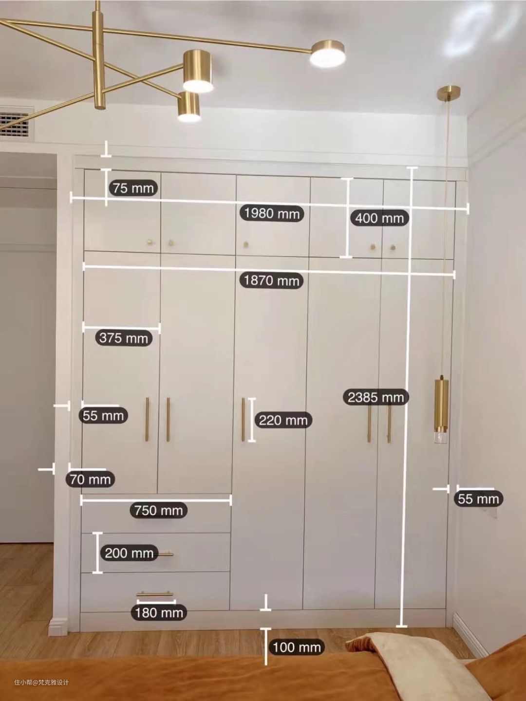 另外,大多衣柜还会专门预留悬挂上衣的柜子,其正常高度一般在850--950,建议预留1000左右,相对较为宽松,还能悬挂稍长款的衣服;