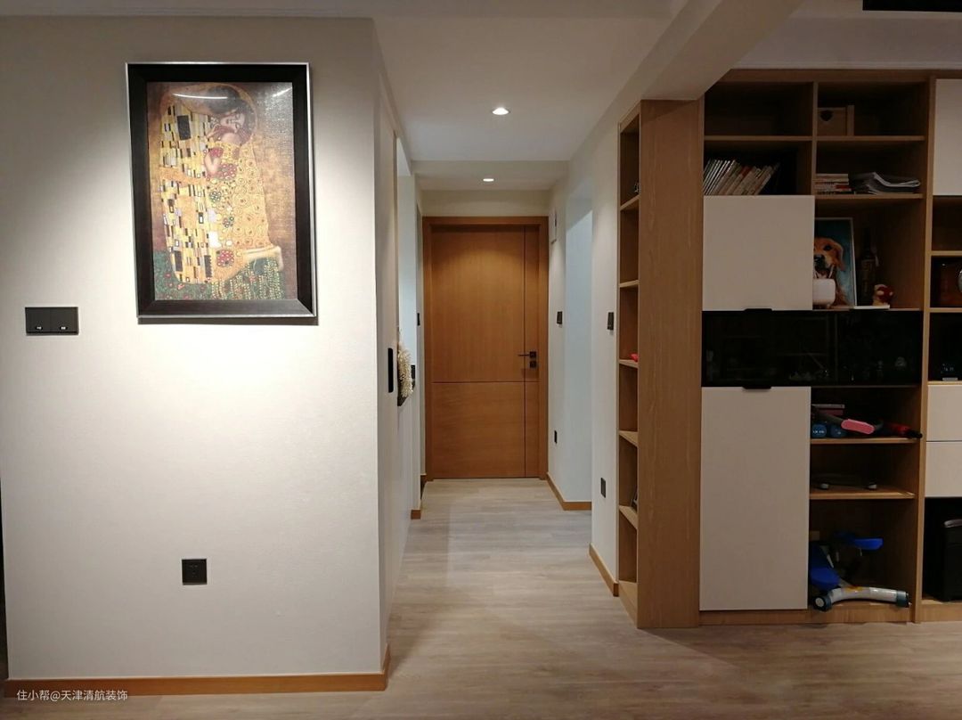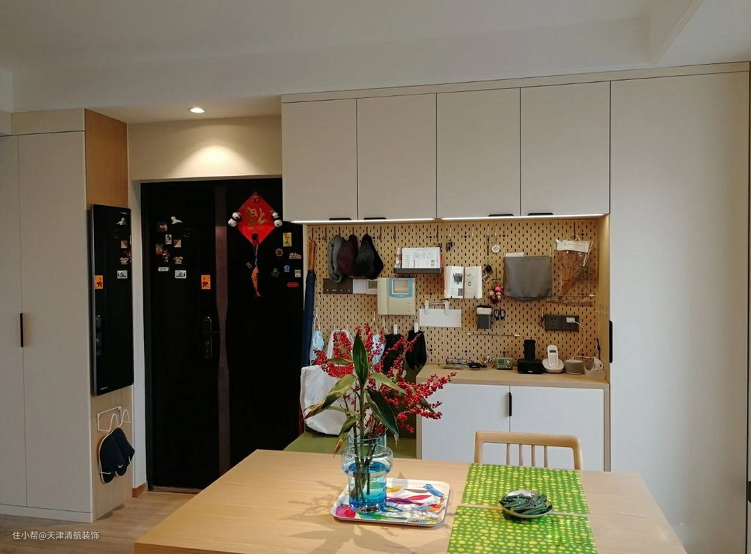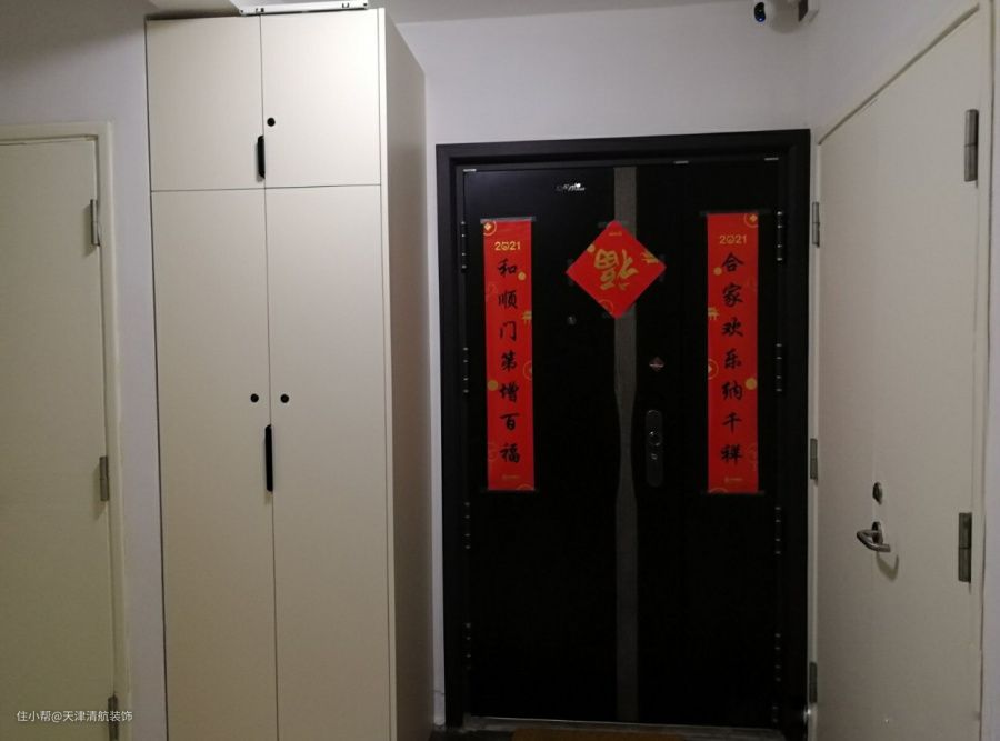 从电梯走出来就是到了自家的门口,所以利用入户大门左侧的位置,做了一个顶天立地的鞋柜,并且带着锁头,更安全有保障。入住的时候,大门贴了对联,显得比较喜庆,更有家的味道。一梯两户的房子,在不影响的情况之下,是可以把空间利用起来。