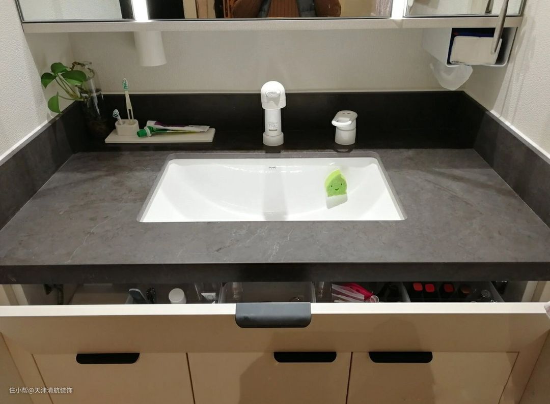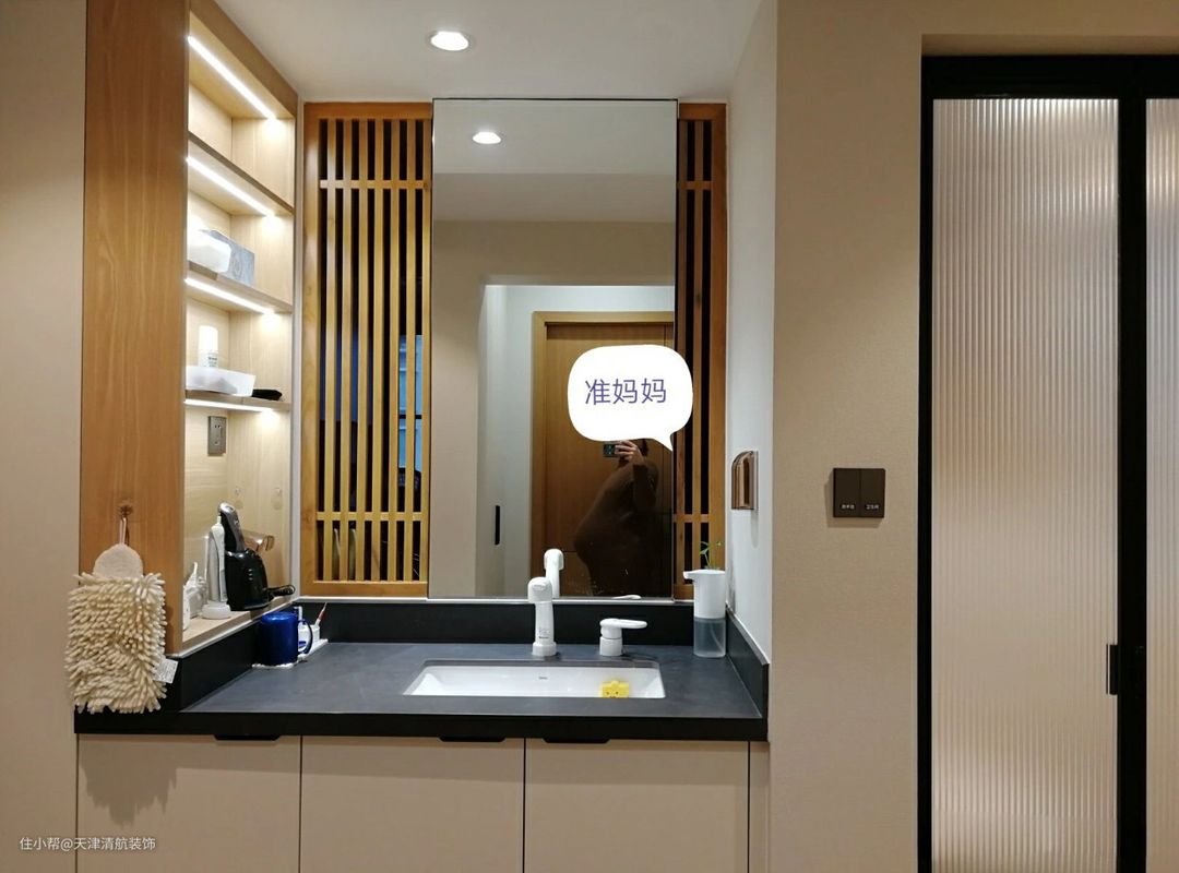 拥有独立的卫生间,把浴室柜是分开出来的,安装了灰色石英石的台面,特别耐脏,使用到的时候方便很多。安装了LED镜子,晚上使用,不会受到任何影响。